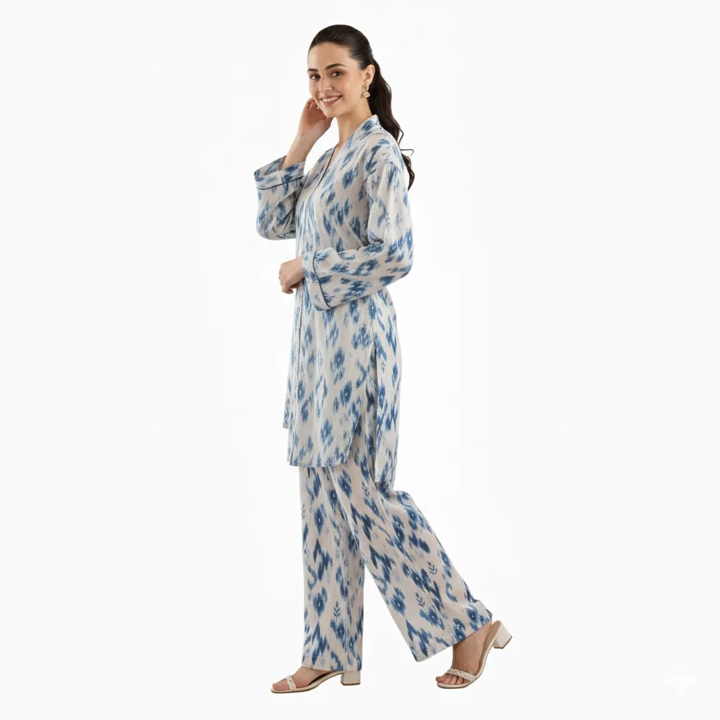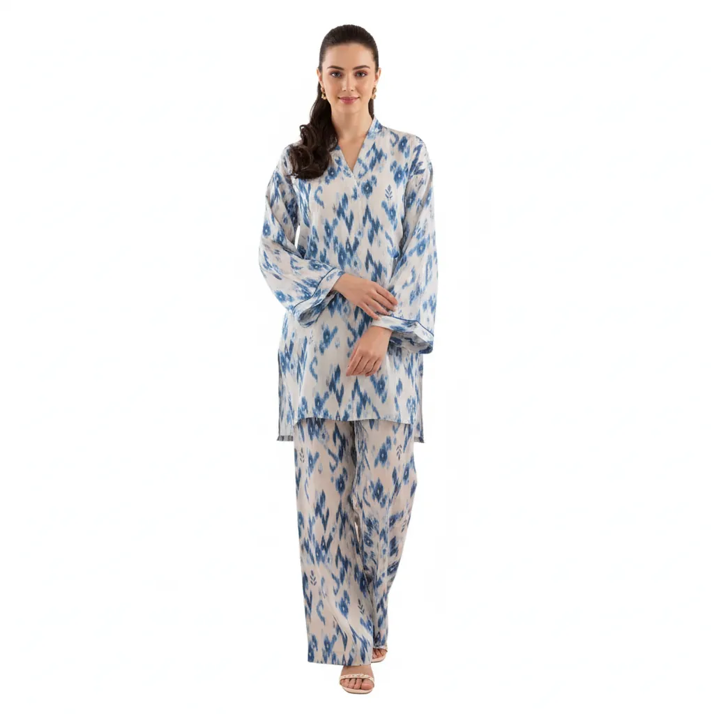 SAYA Unstitched 2-Piece Printed Suit: Blue Ikat-Style Print. An original SAYA unstitched 2-piece suit featuring a digital print in an ikat-style pattern with shades of blue on a light, off-white background.This is an authentic SAYA unstitched 2-piece suit, designed for a stylish look. The set includes a printed shirt and a printed trouser, both featuring a modern, abstract digital print. The color palette is a range of blues, from light to dark, set against a light cream or off-white background.