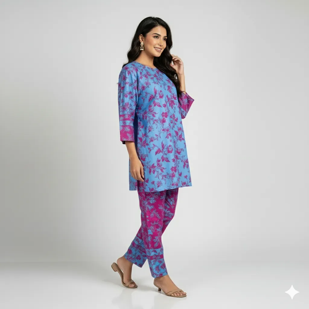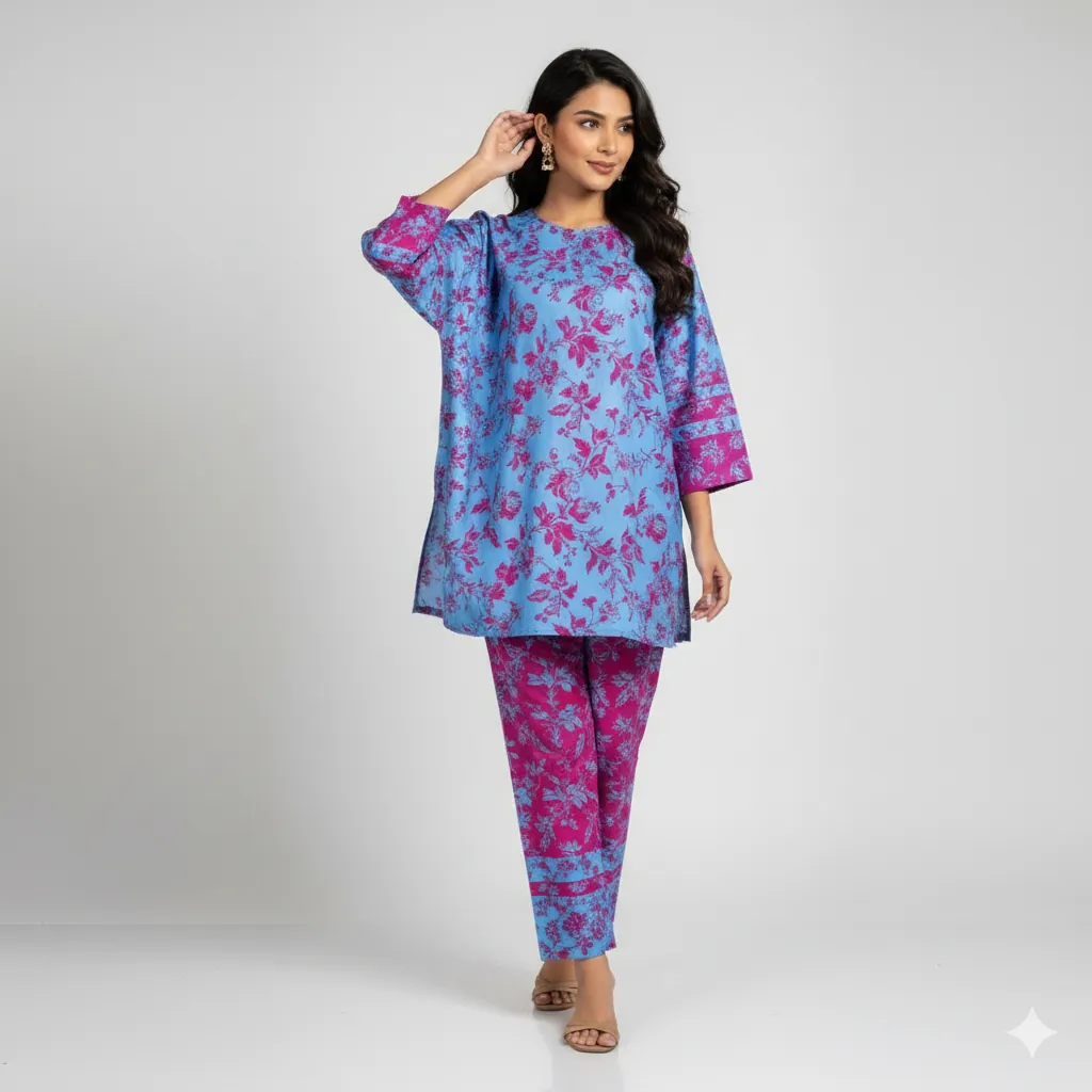 SAYA Unstitched 2-Piece Printed Suit: Light Blue with Pink Floral Print. An original SAYA unstitched 2-piece suit featuring a vibrant floral digital print in pink and magenta on a light blue base.This is an authentic, original SAYA unstitched 2-piece suit. The set includes a printed shirt and a printed trouser, both with a floral design. The primary color of the fabric is a light to medium blue, which forms the background for the print. The floral patterns are a vibrant pink or magenta color.