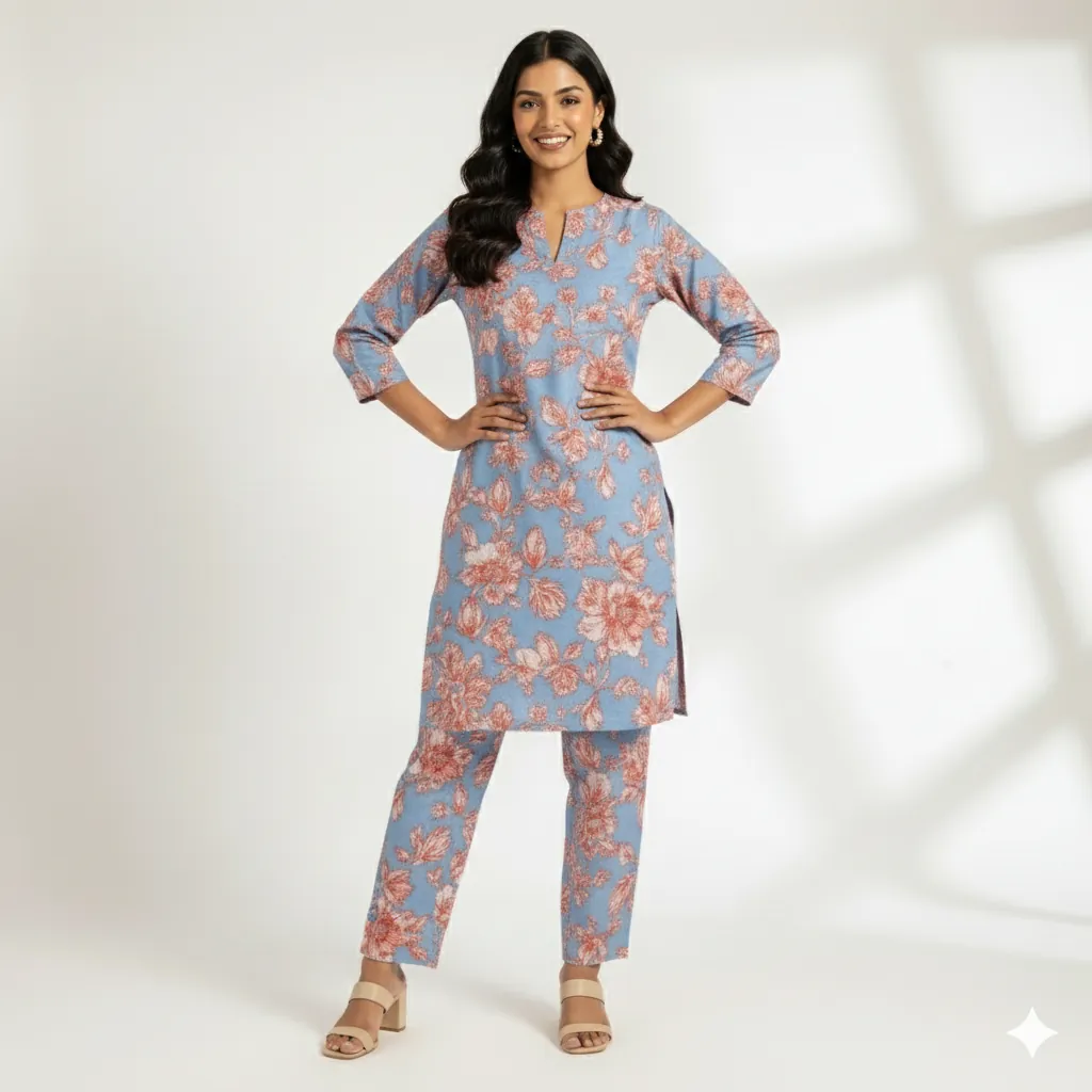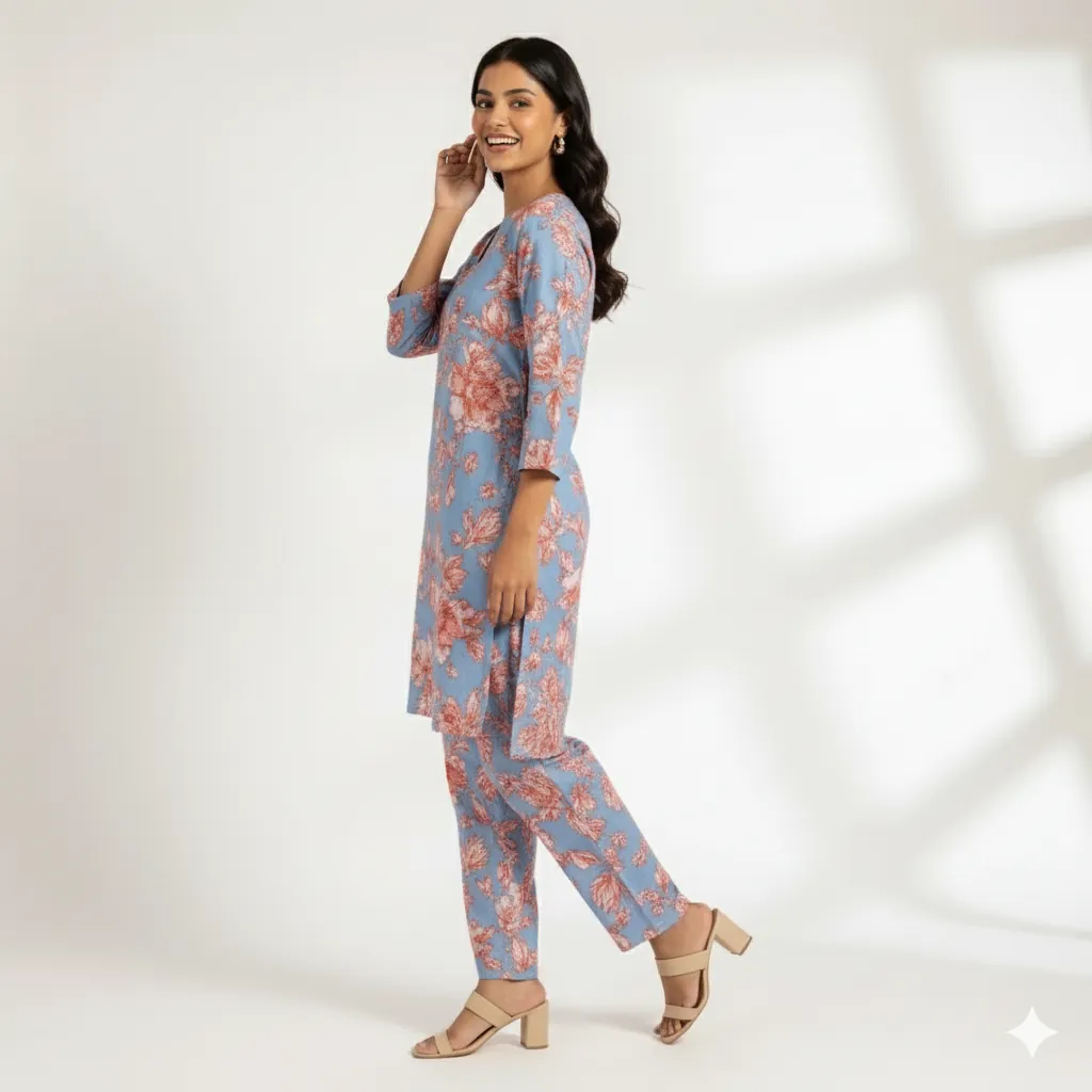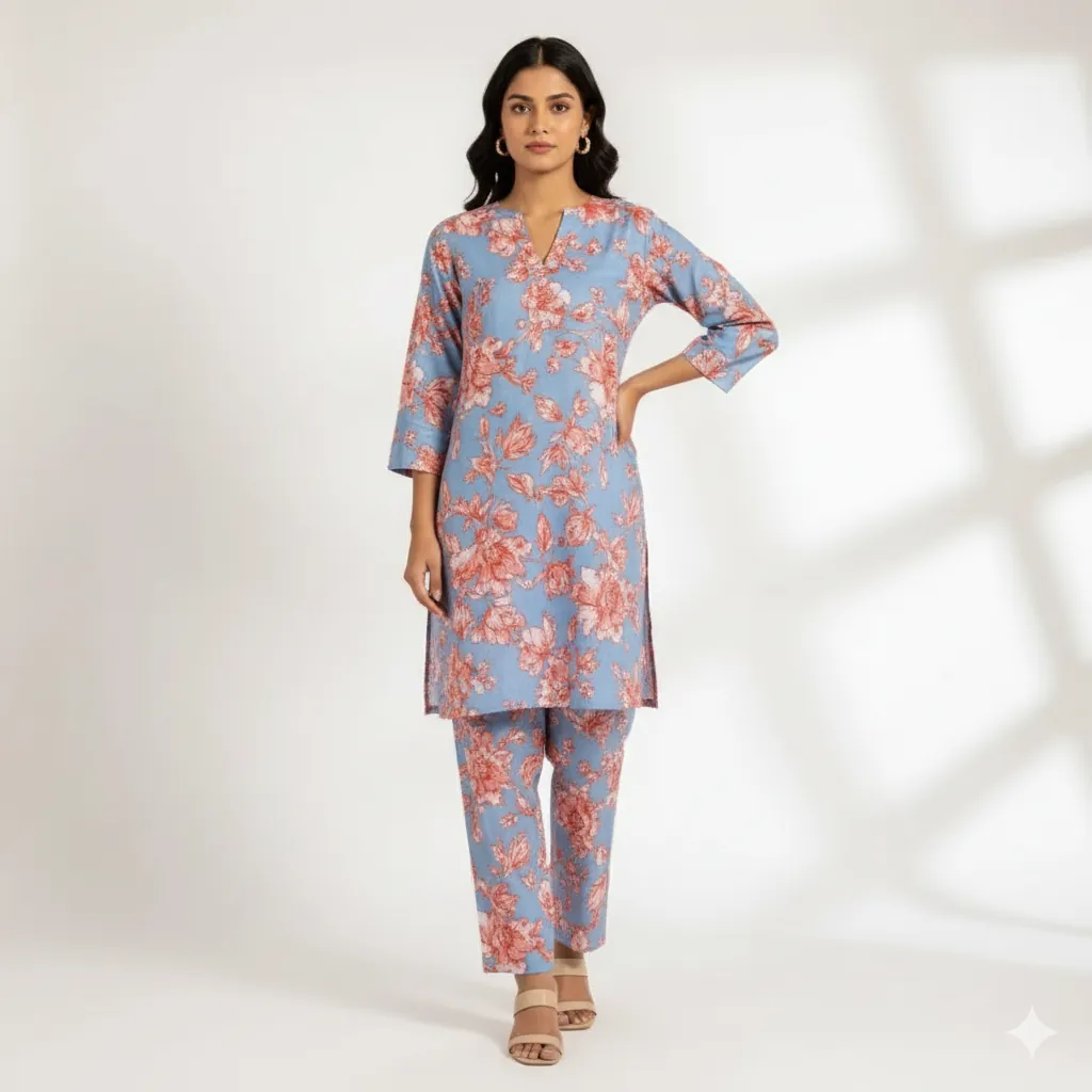 SAYA Unstitched 2-Piece Printed Suit: Pastel Blue with Orange Floral Print. An original SAYA unstitched 2-piece suit featuring a digital print of light orange floral patterns on a pastel blue base. This is an authentic, original SAYA unstitched 2-piece suit. The set includes a printed shirt and a printed trouser, both with a detailed floral design. The base color of the fabric is a light, pastel blue. The floral patterns are a light orange or salmon color, with some darker reddish accents. The trouser is a solid, dyed fabric that matches the light orange or salmon color of the flowers.