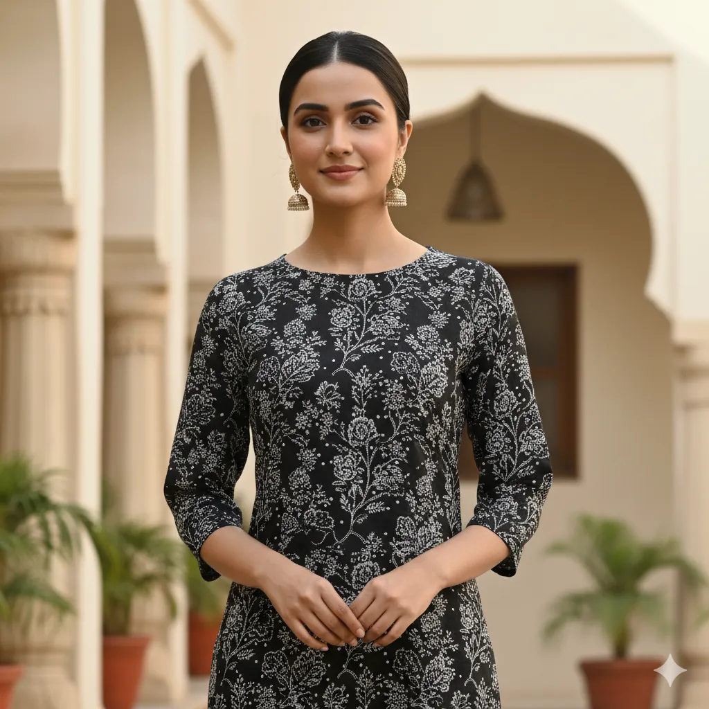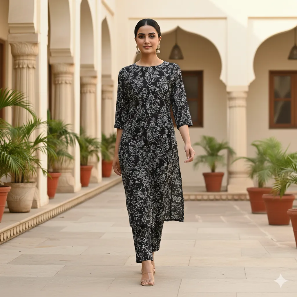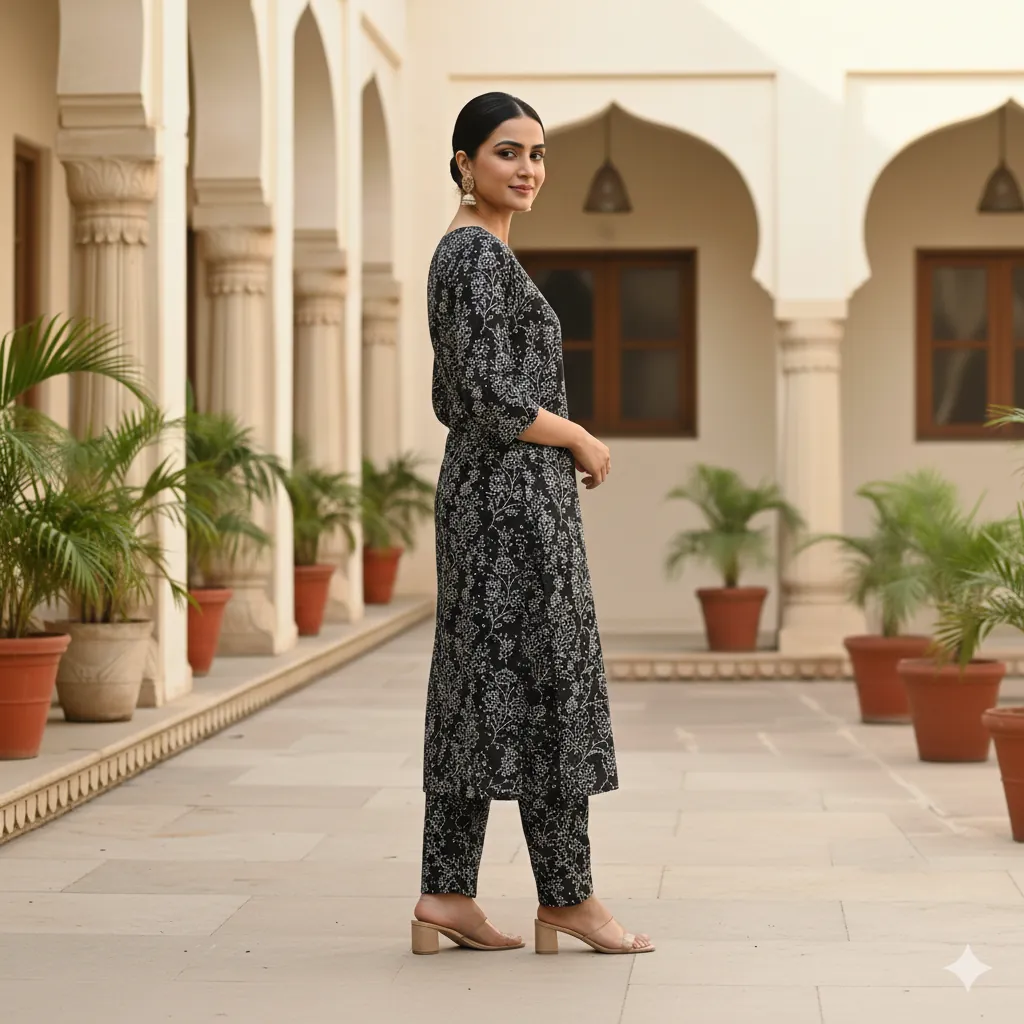 SAYA Unstitched 2-Piece Suit: Black with White Floral Print. An original SAYA unstitched 2-piece suit featuring a contrasting digital print of white flowers and dots on a black base. This is an authentic SAYA unstitched 2-piece suit. The set includes a printed shirt and a printed trouser, both with a detailed floral and dotted design. The base color of the fabric is a solid black. The digital print features a dense pattern of large flowers and small dots in a contrasting white or very light grey color.
