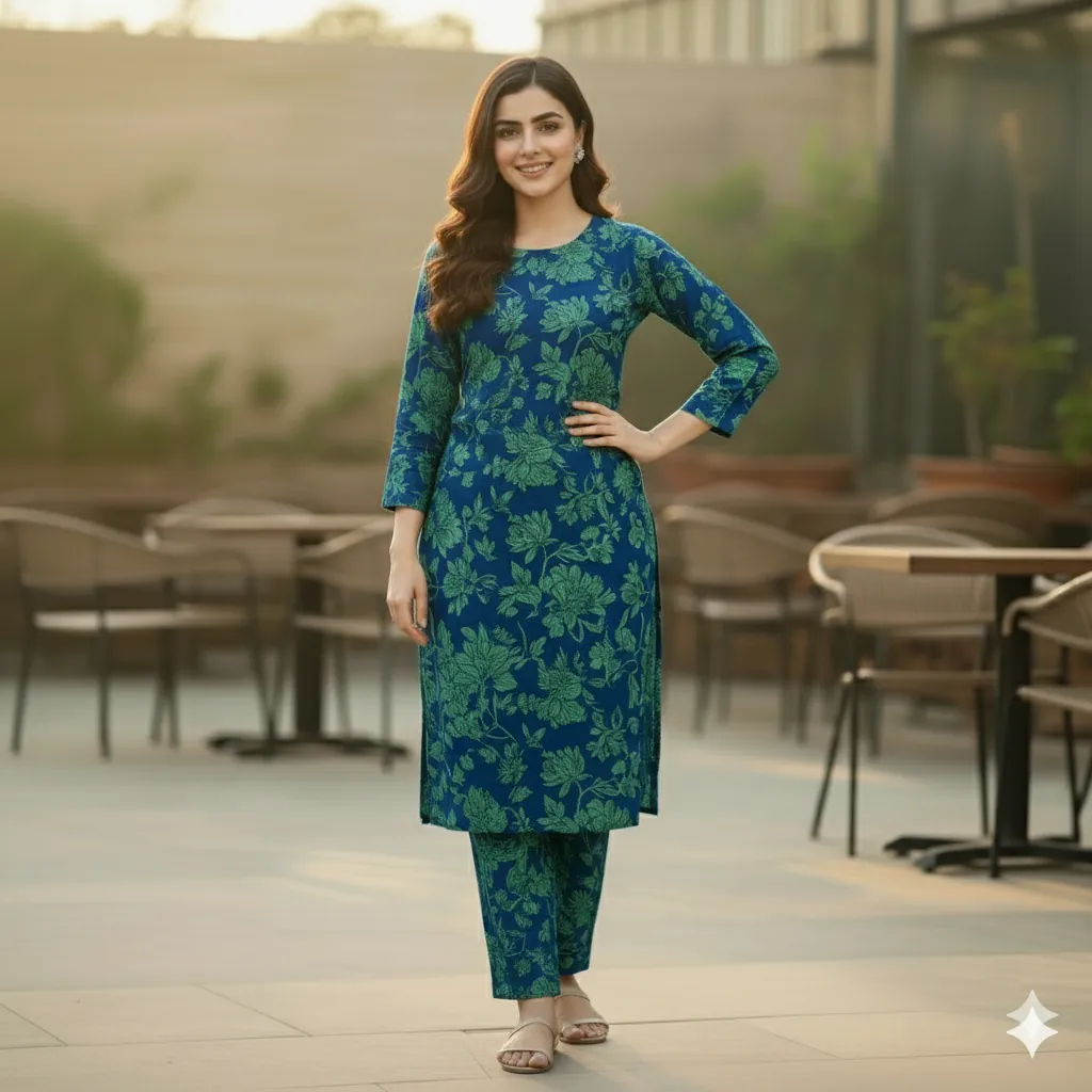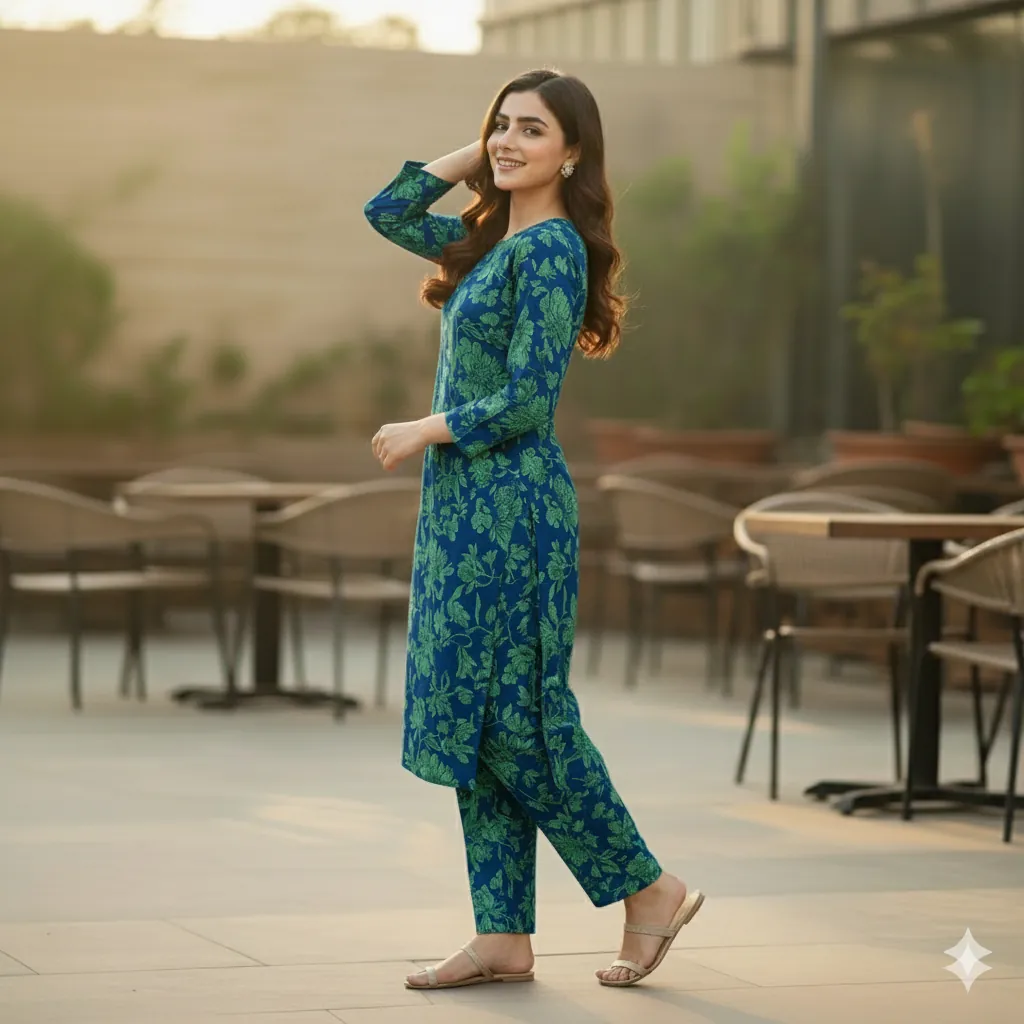SAYA Unstitched 2-Piece Suit: Blue with Green Floral Print. An original SAYA unstitched 2-piece suit with the product code U07-25041-05B, featuring a digital print of vibrant green floral patterns on a rich blue background.This is an authentic SAYA unstitched 2-piece suit, part of the Unstitched Printed Lawn collection. The set includes a printed shirt and a printed trouser, both with a prominent floral and leaf design. The base color of the fabric is a rich, saturated blue. The digital print features a dense pattern of delicate vines and leaves in a contrasting bright green color. The product code for this variation is U07-25041-05B.