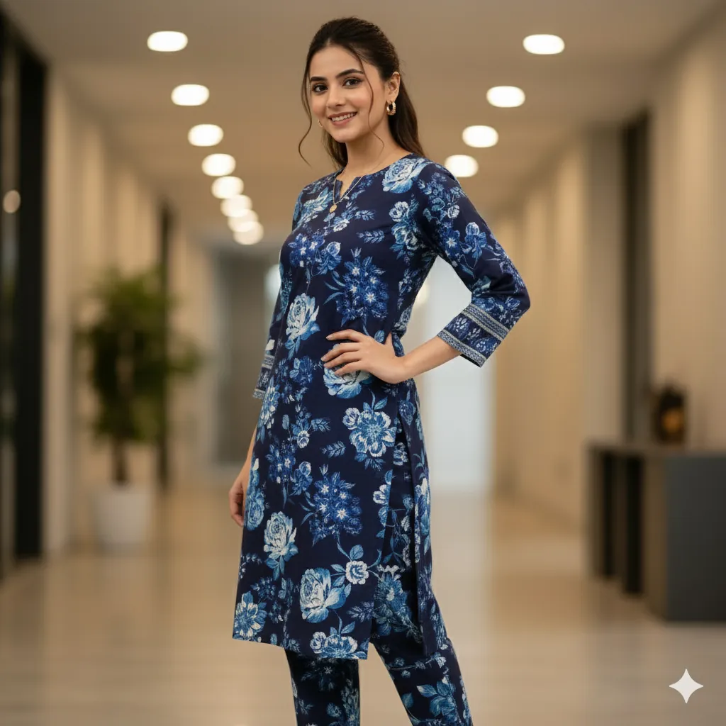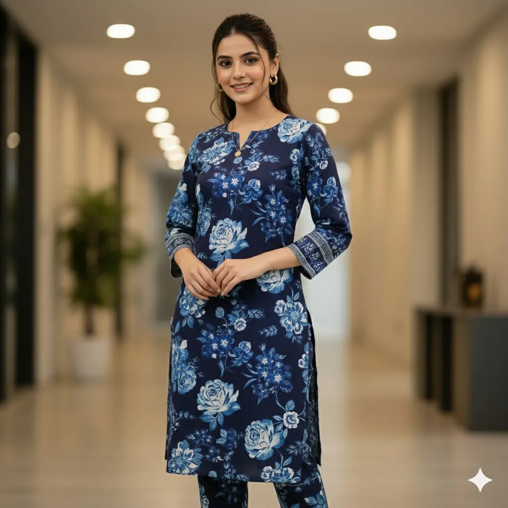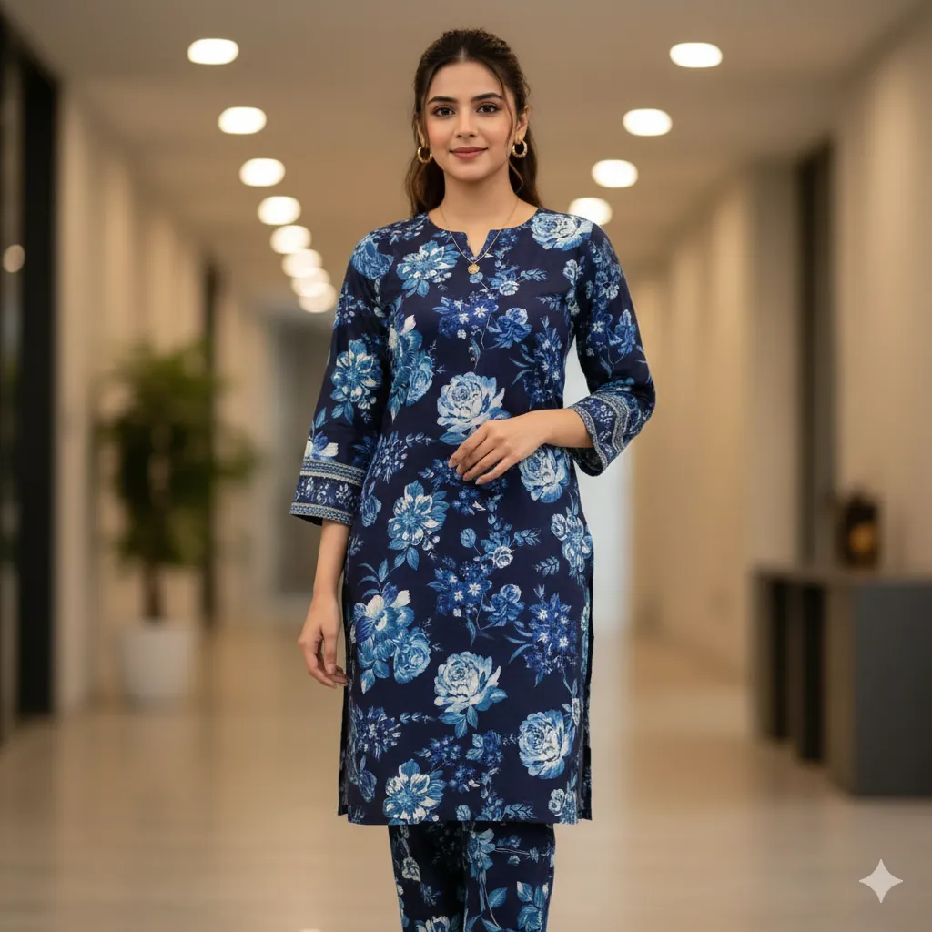 SAYA Unstitched 2-Piece Suit: Dark Blue with Blue and White Floral Print. An original SAYA unstitched 2-piece suit featuring a digital print of lighter blue and white floral patterns on a dark blue background. This is an authentic SAYA unstitched 2-piece suit. The set includes a printed shirt and a printed trouser, both with a detailed floral design. The primary color of the fabric is a deep, dark blue, which serves as the background for the print. The floral patterns are in various shades of lighter blue and white.