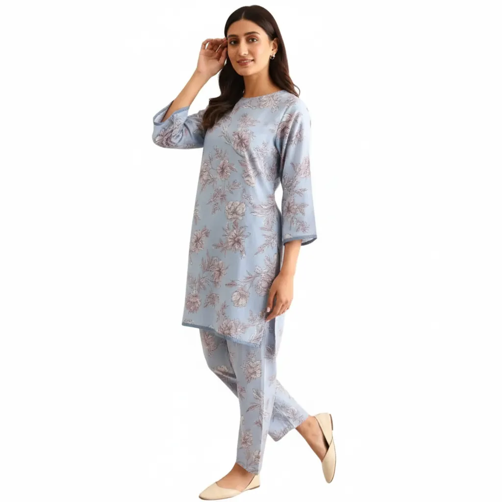 SAYA Unstitched 2-Piece Suit: Light Blue with Purple and White Floral Print. An original SAYA unstitched 2-piece suit featuring a digital print of large flowers and leaves in white and purple on a light blue base.This is an authentic SAYA unstitched 2-piece suit. The set includes a printed shirt and a printed trouser, both with a prominent floral design. The base color of the fabric is a light blue. The digital print features a dense pattern of large flowers and leaves in a contrasting white and purple color.