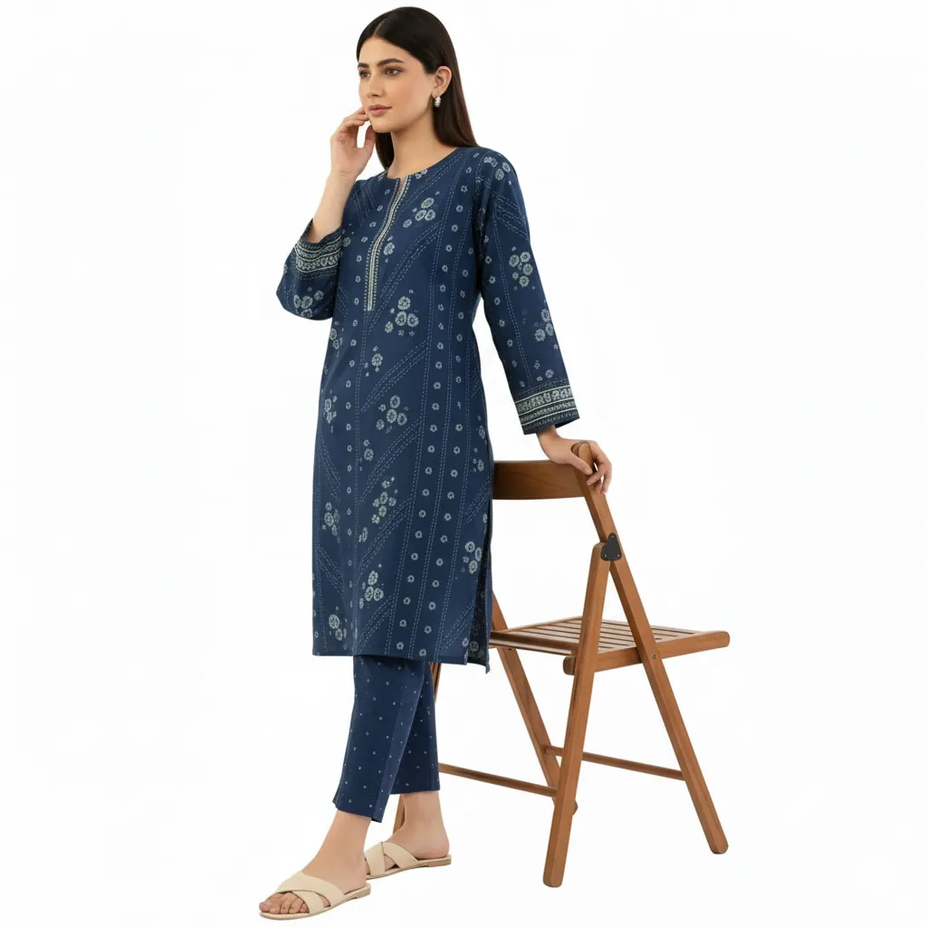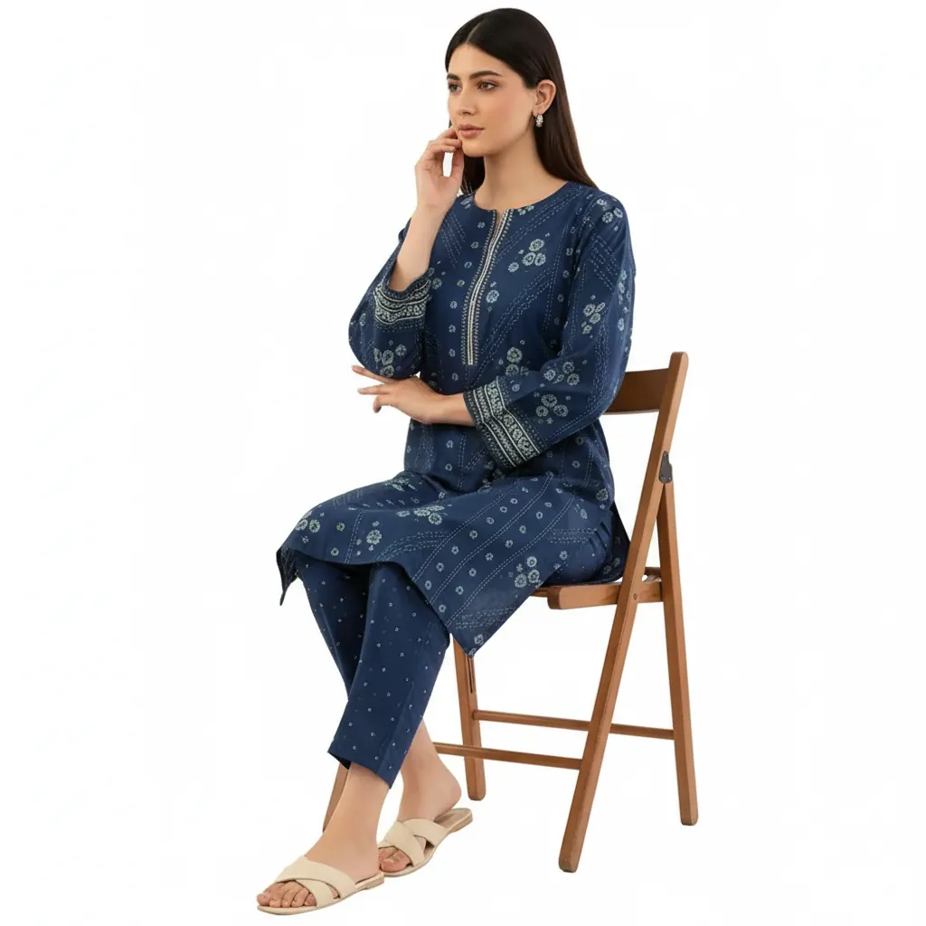 SAYA Unstitched 2-Piece Suit: Navy Blue and White Floral Print. An original SAYA unstitched 2-piece suit featuring a digital print of lighter blue and white floral patterns on a deep navy blue background.This is an authentic SAYA unstitched 2-piece suit. The set includes a printed shirt and a printed trouser, both with a detailed floral design. The primary color of the fabric is a deep, dark navy blue, which serves as the background for the print. The floral patterns are in various shades of lighter blue and off-white.