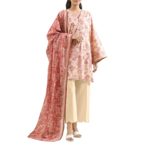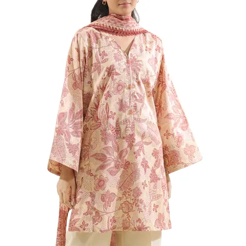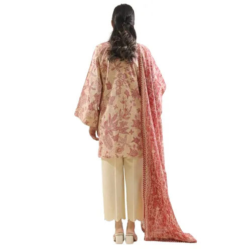 Saya Unstitched Lawn 3-Piece Suit – Soft Peach & Pink Floral Print | Summer Collection 2025. Elevate your summer wardrobe with this beautiful Saya 3-piece unstitched suit from the 2025 Lawn Collection. The set includes a soft peach lawn shirt with delicate pink floral prints, paired with a matching printed lawn dupatta for a refreshing and feminine look. The dyed cambric trouser in a soft blush tone adds simplicity and elegance. This lightweight, breathable fabric is ideal for hot weather and can be tailored to your style.