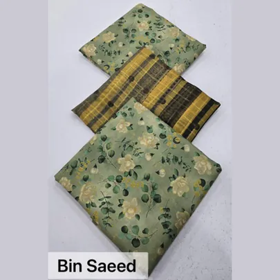 Immerse yourself in the tranquil beauty of Bin Saeed Lawn 2025 with this distinctive 3-piece unstitched printed lawn suit for women. The set includes fabric for the shirt, dupatta (scarf), and trousers, all showcasing a gentle and unique floral and botanical print on high-quality, breathable lawn material. The soft green hues, combined with delicate floral and leaf motifs, create a serene and sophisticated aesthetic. This unstitched fabric offers the freedom to tailor the suit to your preferred style and fit, ensuring comfort and a touch of understated elegance for warmer days. The subtle yet captivating print is a hallmark of Bin Saeed's refined design approach. Refresh your summer wardrobe with this elegant 3-piece unstitched lawn suit from the latest Bin Saeed collection. This beautiful ensemble combines a delicate floral print with a modern plaid design, creating a sophisticated and unique look that is perfect for both casual and semi-formal occasions. The unstitched fabric gives you the creative freedom to design and tailor an outfit that fits your style and measurements perfectly.