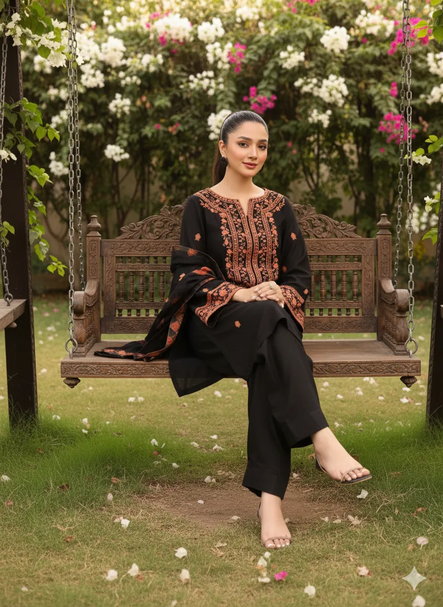 Step into the new season with the Shaista Lodhi Hit Article 2K25, a luxurious and high-quality winter collection. This traditional three-piece cotton suit is a perfect blend of classic style and modern craftsmanship. The shirt boasts a heavy Galla embroidery in a handmade style, creating a striking focal point. The sleeves are also adorned with the same intricate machine embroidery, giving the entire outfit a cohesive and elegant look.