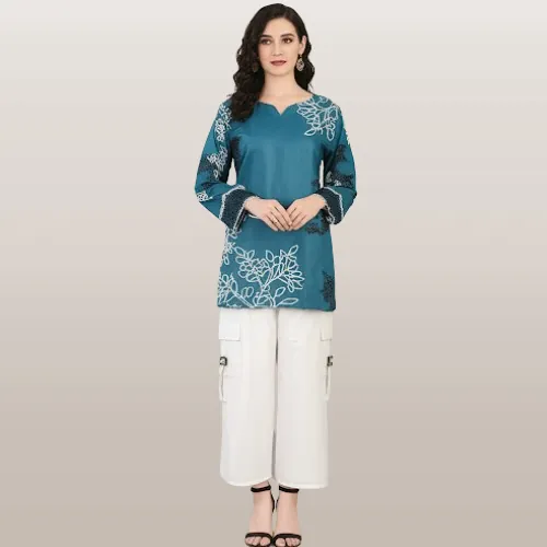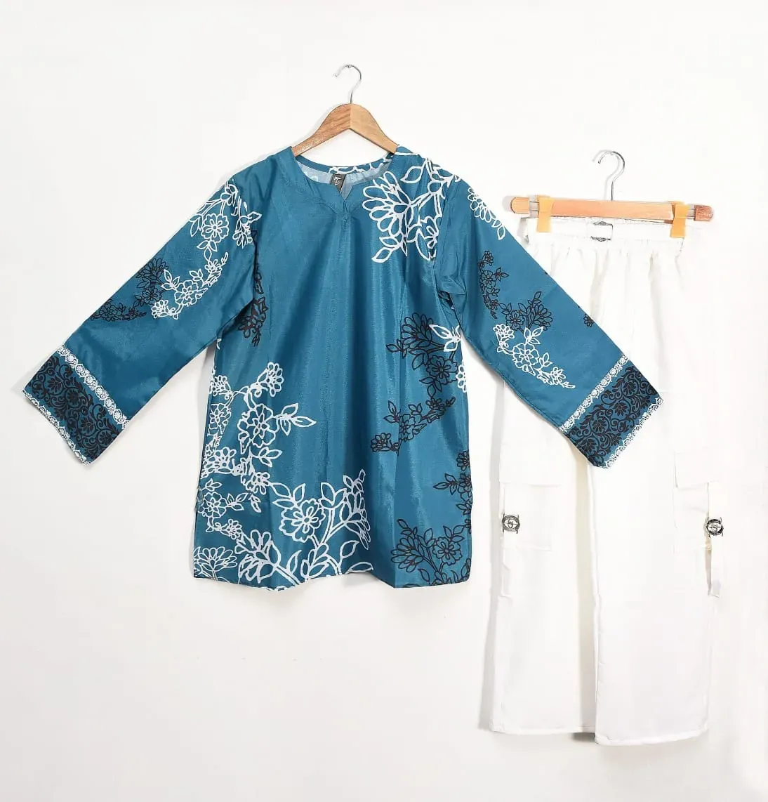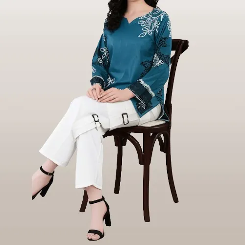 Silk Blend Printed 2-Piece Suit – Elegant Floral Shirt & Trouser Set in Teal.Step into elegance with our Silk Blend Printed 2-Piece Suit. This ensemble features a stunning teal V-neck shirt, crafted from a high-quality silk blend fabric and adorned with a delicate floral print in white and black. The three-quarter sleeves are finished with a stylish border, adding a touch of sophistication. Complementing the shirt is a pair of pristine white, relaxed-fit trousers with a comfortable elasticated waist. Perfect for casual outings, semi-formal events, or relaxed gatherings, this suit combines comfort and style seamlessly. The lightweight and smooth silk blend fabric ensures a flattering fit and all-day ease.