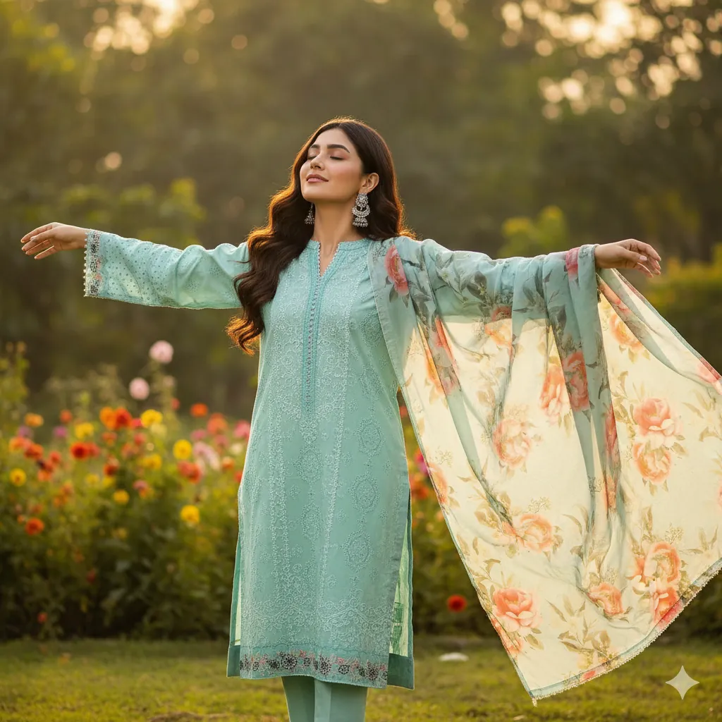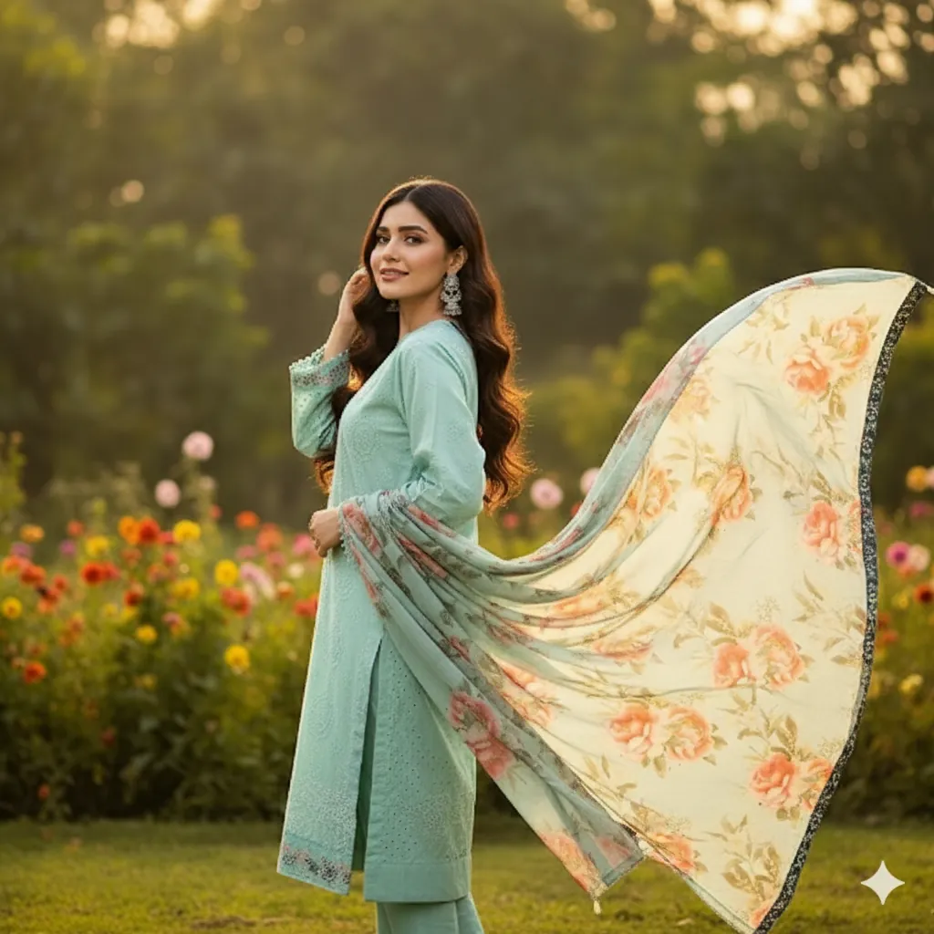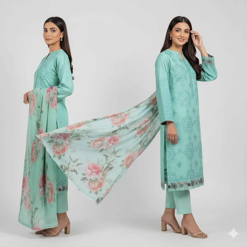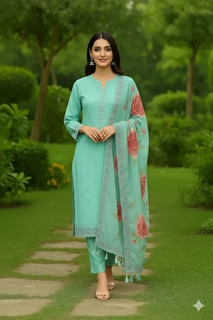 Sky Blue Unstitched Chikan Kari Embroidered Suit with Digital Printed Dupatta. This elegant, unstitched sky blue 3-piece suit is a perfect blend of traditional design and modern style. The outfit features a beautifully embroidered shirt with intricate Chikan Kari work on the front and back. The suit includes all the components you need for a customized, high-end look: a separate embroidered neck patch, a detailed daman patch for the hem, and embroidered sleeve patches. The ensemble is completed with a stunning digital print dupatta that adds a vibrant floral contrast, and a piece of matching fabric for the trousers. This complete package allows you to create a personalized outfit, perfect for any casual or semi-formal event.
