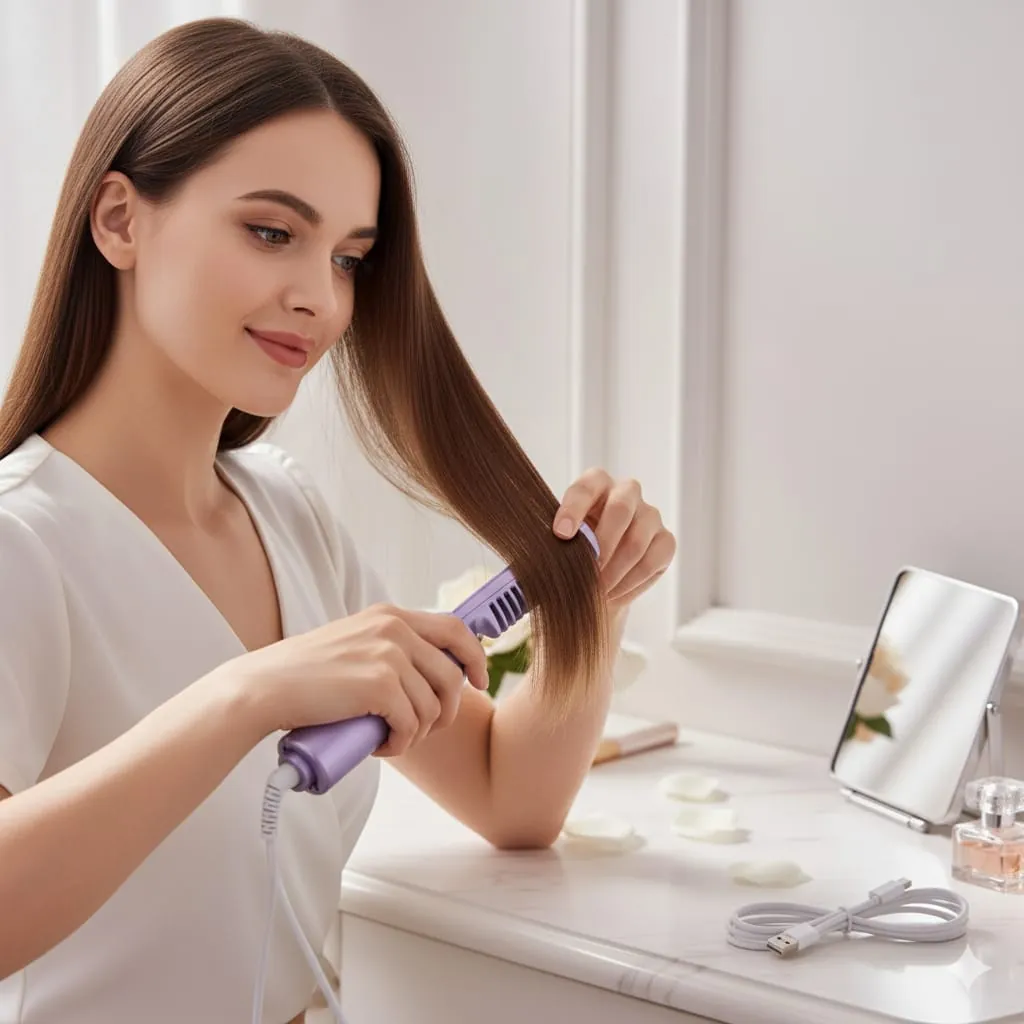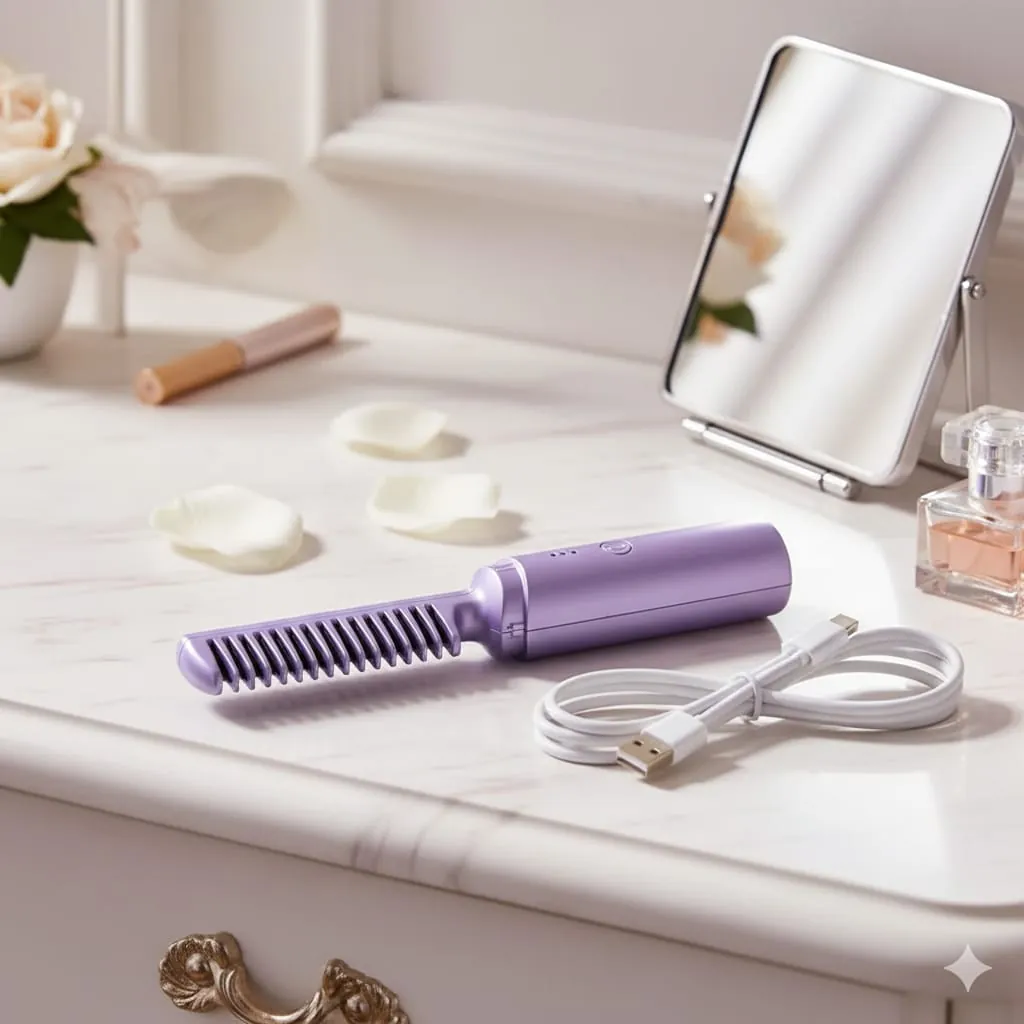 SleekStyle Premium Ceramic Hair Straightening Brush with Advanced Heat Technology for Effortless, Shiny, and Damage-Free Styling.Elevate your haircare routine with the SleekStyle Premium Ceramic Hair Straightening Brush with Advanced Heat Technology for Effortless, Shiny, and Damage-Free Styling, a must-have tool for achieving salon-quality straight hair at home. Encased in a sleek purple body, this innovative brush combines the functionality of a straightener with the gentleness of a brush, featuring a row of heated ceramic-coated teeth that glide through hair to eliminate frizz and add a natural sheen. The advanced ceramic technology ensures even heat distribution, minimizing damage while maximizing smoothness, making it ideal for all hair types.