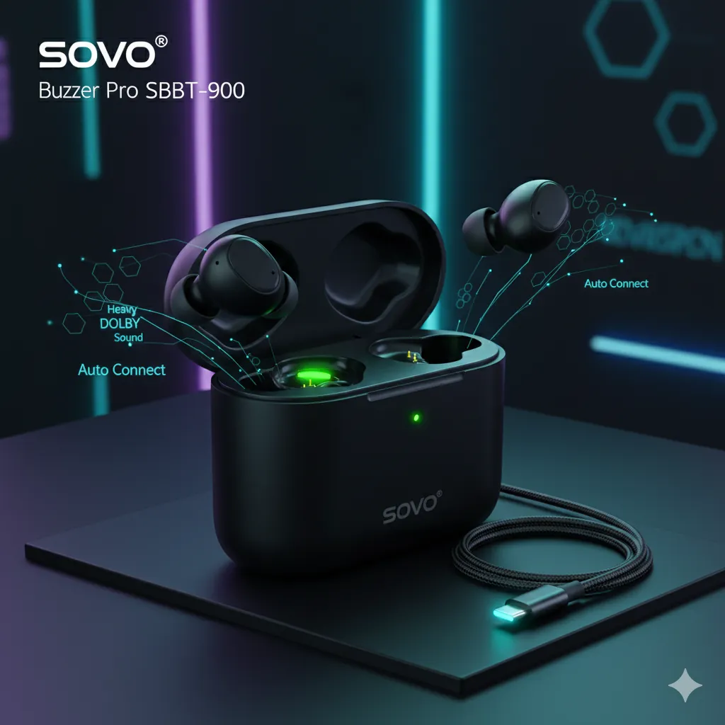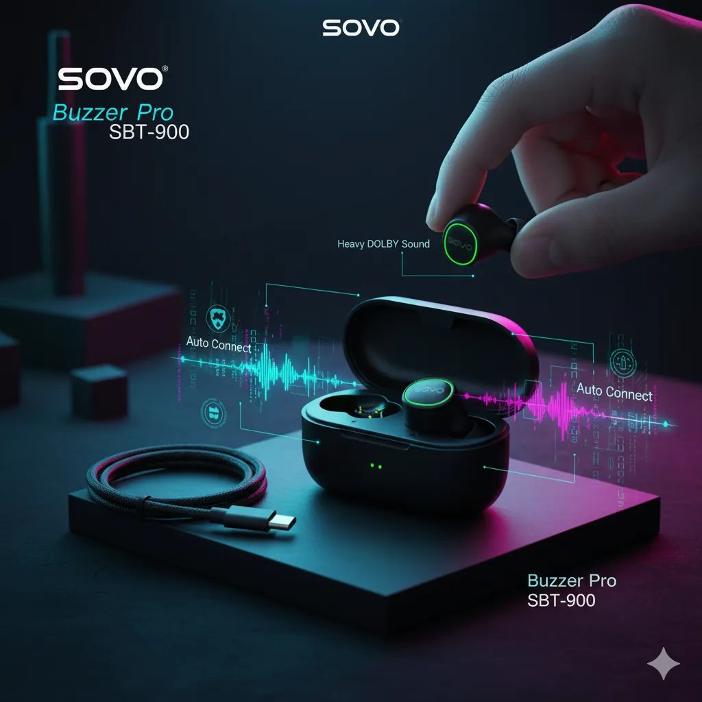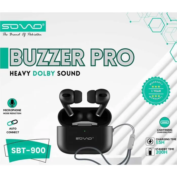 SOVO BUZZER PRO SBT-900 TWS Earbuds | Heavy DOLBY Sound & 1 Year Warranty. Elevate your audio experience with the SOVO BUZZER PRO SBT-900 Wireless Earbuds, proudly brought to you by SOVO, "The Brand of Pakistan." Designed for serious music lovers, these TWS (True Wireless Stereo) earbuds deliver an immersive Heavy DOLBY Sound experience with HiFi High-Fidelity Audio quality and enhanced bass response.
