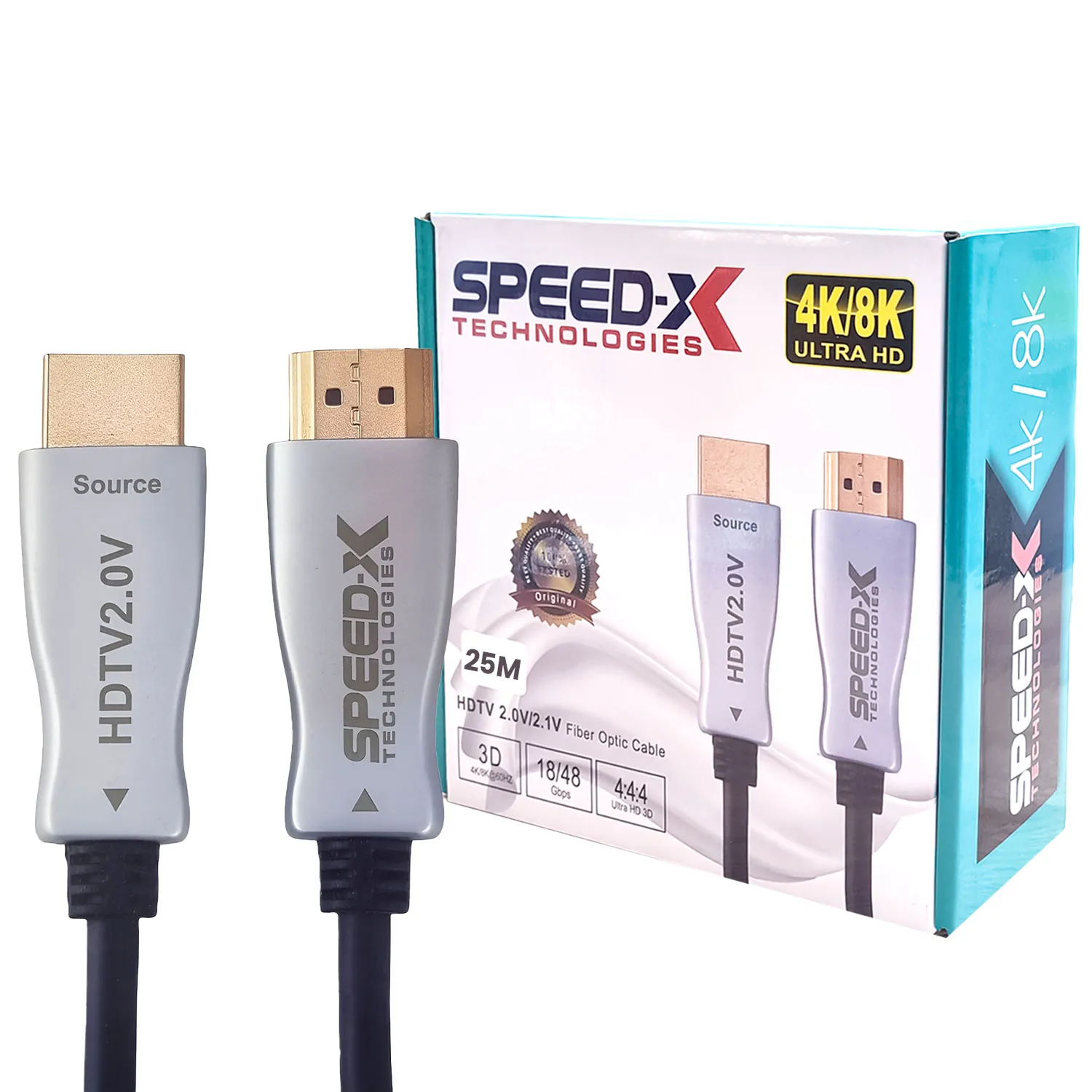 Achieve guaranteed, zero-loss signal integrity over long distances with the SPEED-X 20M Fiber Optic Active Optical Cable (AOC). Utilizing a hybrid structure of fiber optic cores and supplementary 30AWG copper conductors, this HDMI 2.1 cable is engineered to meet the demanding bandwidth requirements of the latest Ultra High Definition (UHD) devices.