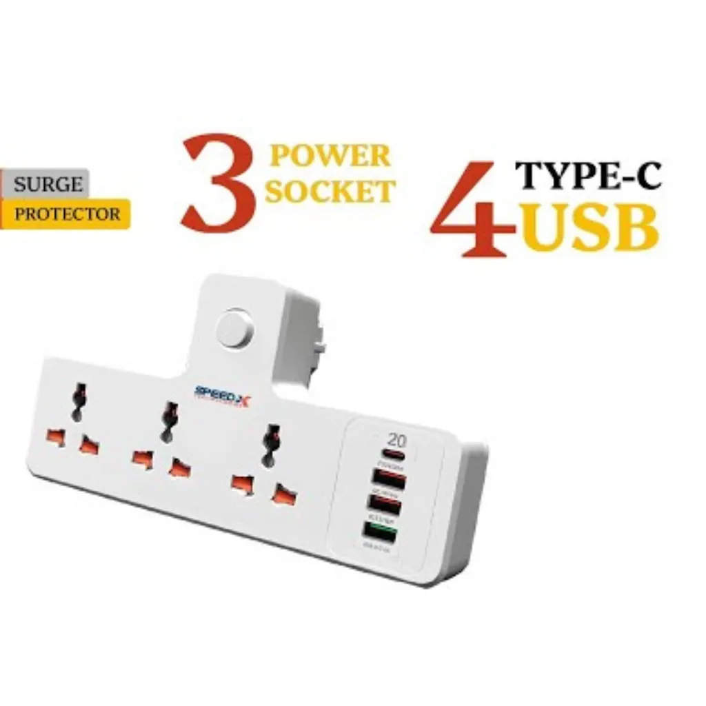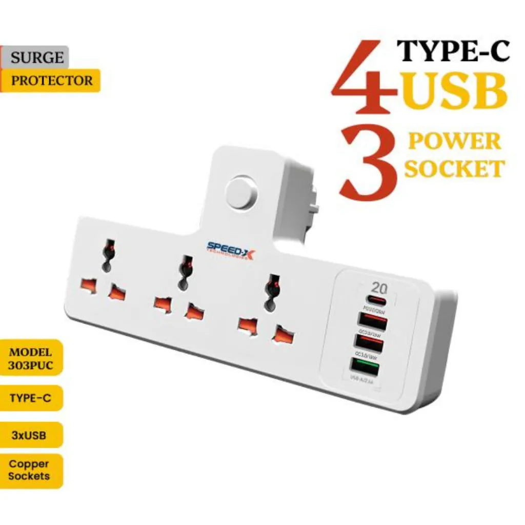 The SPEED-X 304PUC Premium Portable Power Strip is designed for modern users who need versatility, performance, and safety in one compact device. It features 3 universal sockets compatible with all plug types, along with 3 USB ports and 1 fast Type-C port for quick and efficient charging of smartphones, tablets, and other smart devices.