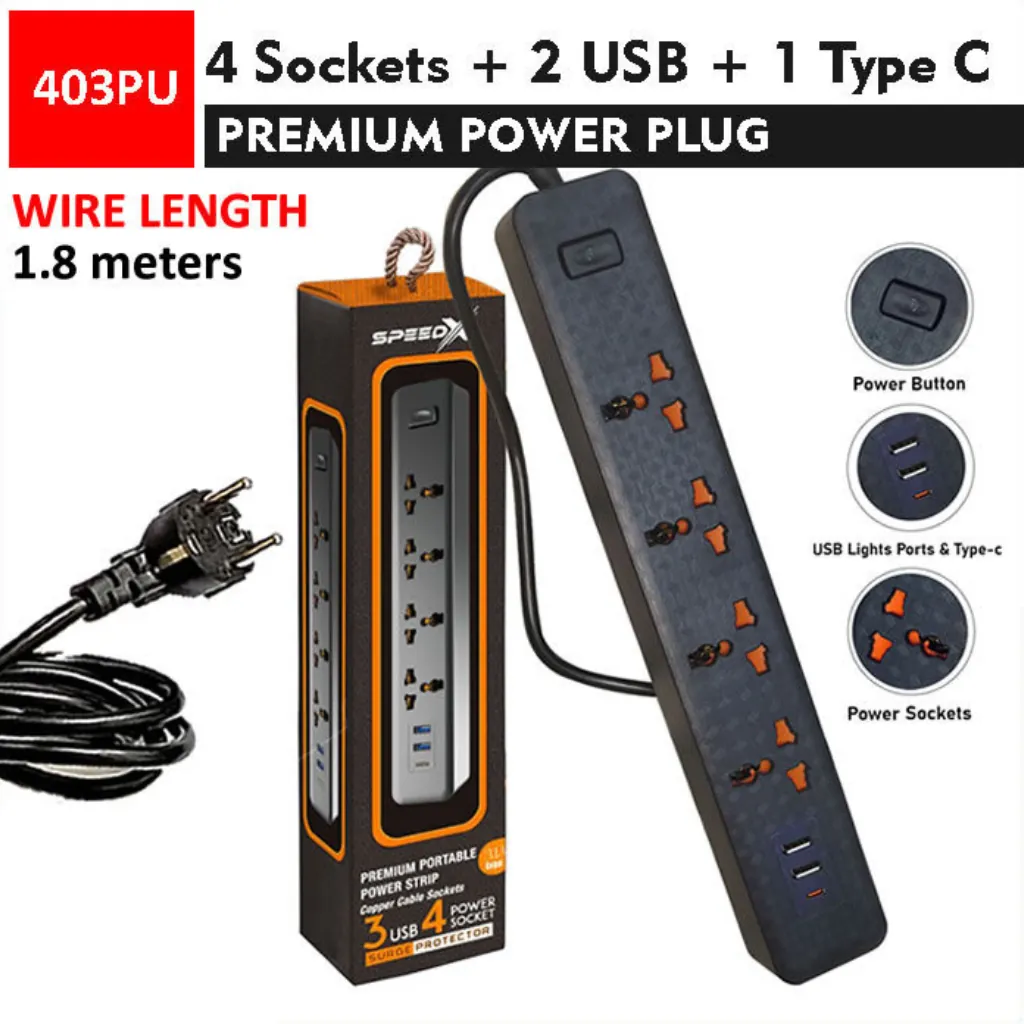 The SPEED-X 403PUC Power Strip features 4 universal sockets, 2 USB ports, and 1 Type-C fast charging port — providing a reliable, all-in-one power solution for home, office, or travel use.