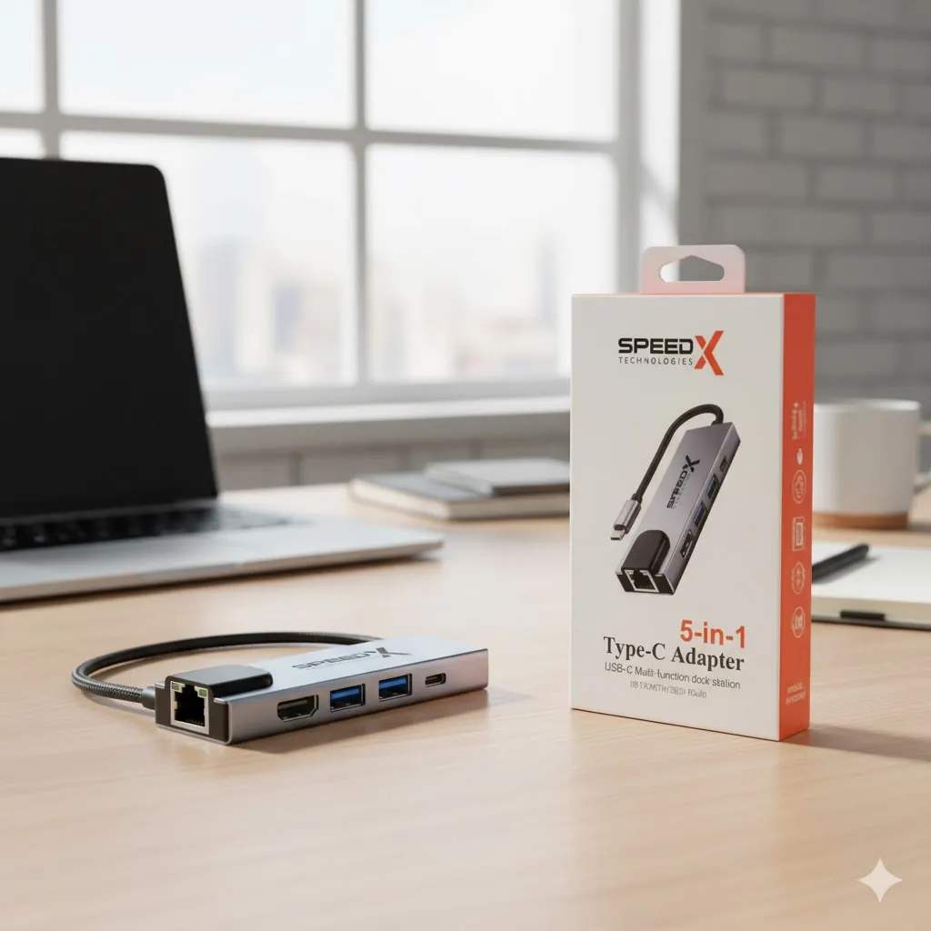 The Speed-X 5-in-1 Type-C Adapter is a desktop solution for connectivity. It delivers crisp 4K HDMI video, stable Gigabit Ethernet (LAN) access, and two 5Gbps USB 3.0 ports for peripherals. The dedicated Power Delivery (PD) port ensures your laptop charges quickly (up to 100W supported) while you work