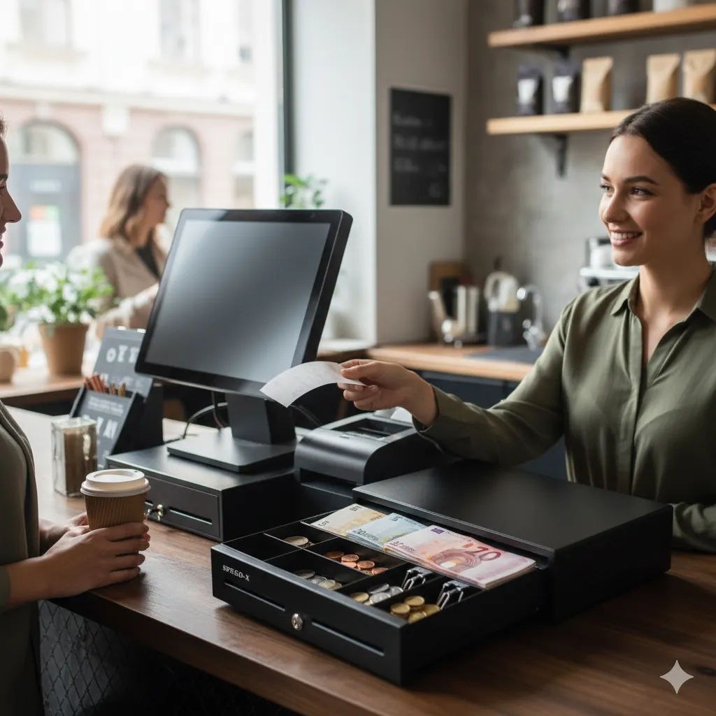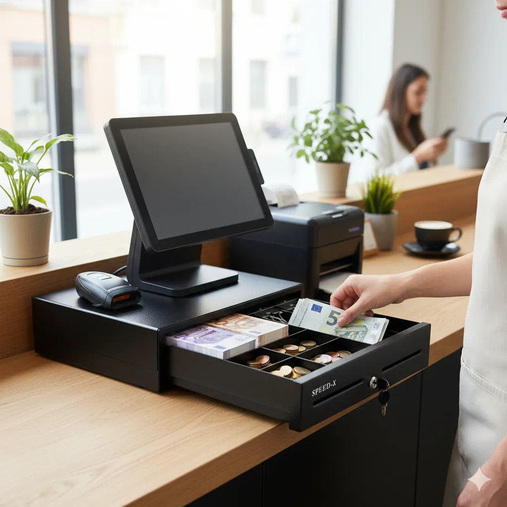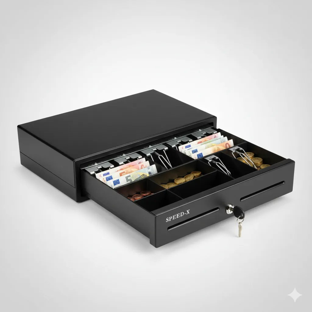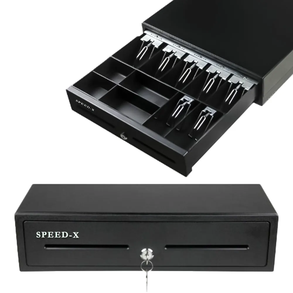SPEED-X 7 Bill 4 Coins High Temperature Paint Cash Drawer Metal. Standard Cash Drawer with Heavy-Duty Metal Rollers • Scratch Resistant Textured Hybrid Powdered Coat Finish • 7 Bills / 4 Coins • Adjustable Dividers / Removable Coin Tray Drawer Type Standard Cash Drawer with Heavy-duty Metal Rollers Dimensions (in) 15.7”W x 16.1”D x 3.3”H (inch, without feet) Dimensions (mm) 400W x 410D x 85H (mm, without feet) Packaging (mm) 490W x 480D x 163H (mm) Cash drawer will be connected to POS system through RJ11 port.