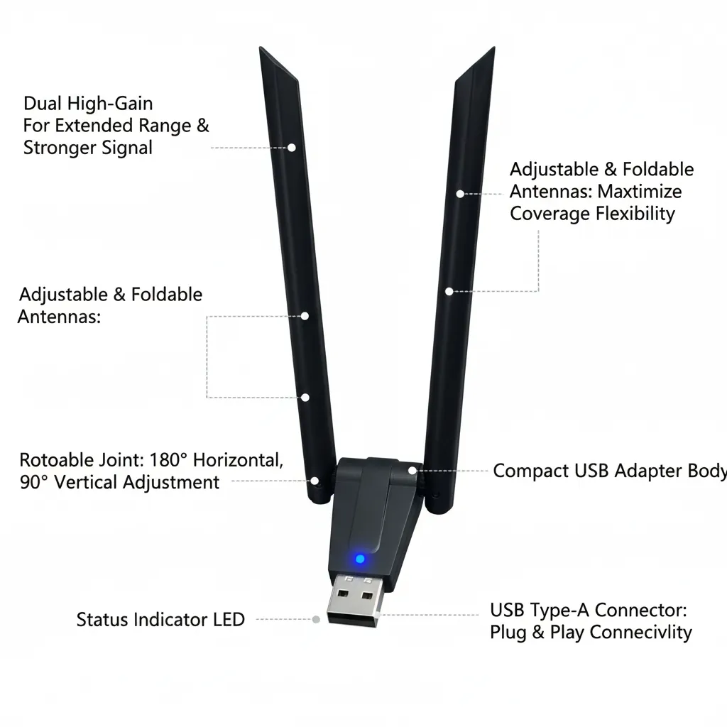 Operating on the 2.4GHz frequency band, this adapter supports speeds up to 300Mbps, offering smooth and reliable connectivity even in areas with weak Wi-Fi signals. With Plug & Play compatibility on most operating systems (Windows, macOS, Linux), setup is quick and hassle-free.
