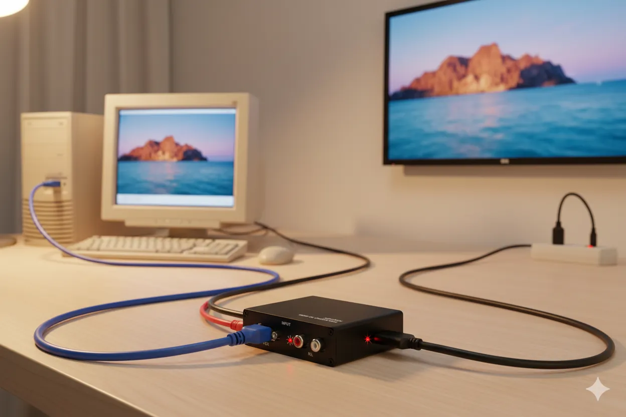 Easily connect your older VGA-enabled devices such as PCs, laptops, or projectors to modern HDMI displays, monitors, or TVs. This converter box efficiently transforms VGA analog signals into HDMI digital output, delivering crisp and clear video quality for both home and office use.
