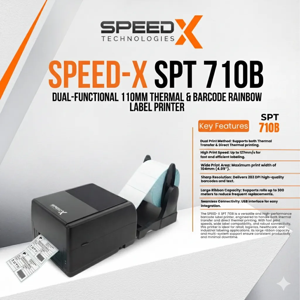 The SPEED-X SPT 710B Dual-Functional 110mm Thermal and Barcode Rainbow Label Printer is a high-performance, multi-purpose printer designed to meet the needs of modern businesses.