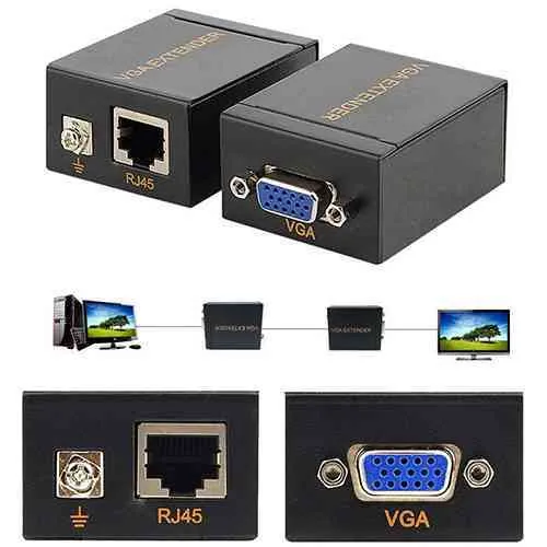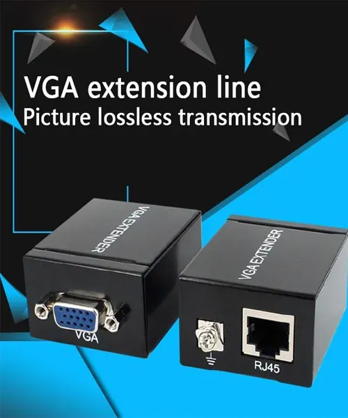 Easily extend your VGA signal up to 60 meters using this high-quality VGA Extender Set. The kit includes a signal transmitter and receiver, enabling long-distance VGA video transmission over a single CAT5 or CAT6 network cable. Designed for PCs, DVRs, projectors, and monitoring systems, this extender provides stable, clear video without the need for an external power supply.