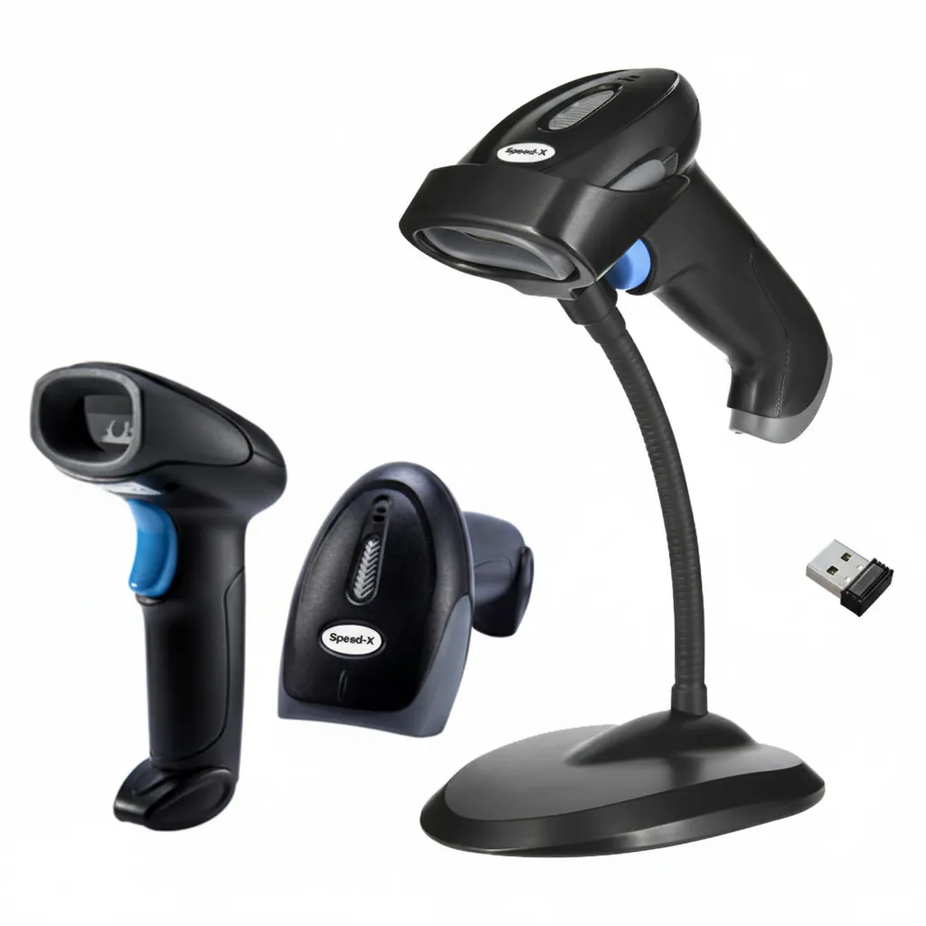 The Speed-X Wireless 2D Barcode Scanner Kit is designed for efficient data capture in demanding retail, warehouse, and office environments. This all-in-one kit includes a ergonomic black handheld scanner with blue accents, a flexible gooseneck presentation stand for fixed-position scanning, a compact charging cradle, and a 2.4GHz USB wireless dongle for plug-and-play connectivity. Utilizing advanced CMOS imaging technology, it effortlessly reads all major 1D and 2D barcodes, including QR codes, Data Matrix, PDF417, and UPC/EAN, even on mobile screens or damaged labels. With a rechargeable 2200mAh battery offering up to 36 hours of continuous use and a rapid scanning speed of 300 times per second, this kit enhances productivity while minimizing errors. The durable construction withstands drops from 1.5m onto concrete, ensuring reliability in high-volume operations. Ideal for point-of-sale systems, inventory management, and logistics, the Speed-X kit combines mobility, speed, and versatility to streamline your workflow.Key Features- Wireless Connectivity: 2.4GHz RF technology with USB dongle for lag-free scanning up to 30 meters indoors.
