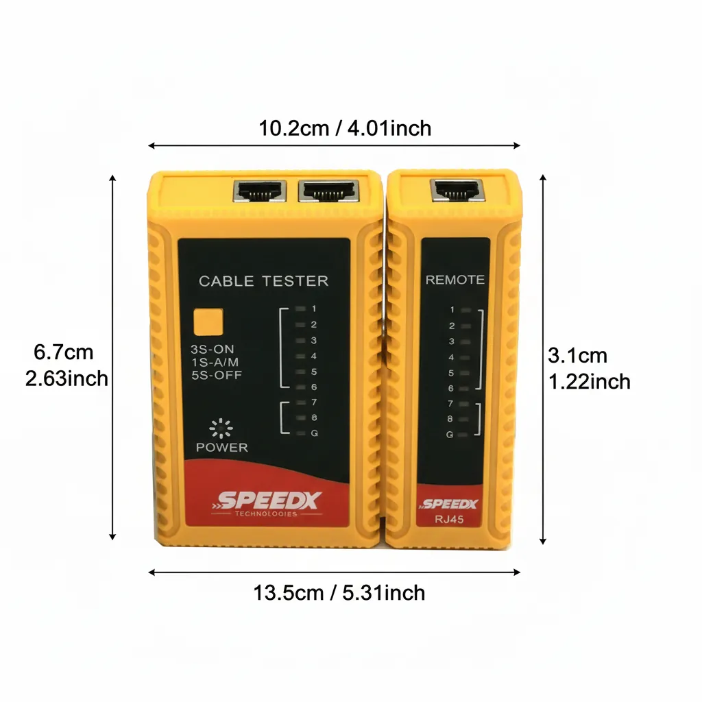 The SPEEDX 368A Network Cable Tester is a fast, reliable, and essential diagnostic tool for IT professionals, network installers, and DIY tech users. Designed to quickly verify the continuity and wiring configuration of RJ45 Ethernet (LAN) cables, this checker instantly identifies common cabling faults, saving you time and effort on installation and troubleshooting. The tester consists of two units: the Main Unit (Tester) and the Remote Unit, which separate easily for testing long runs of installed cables.