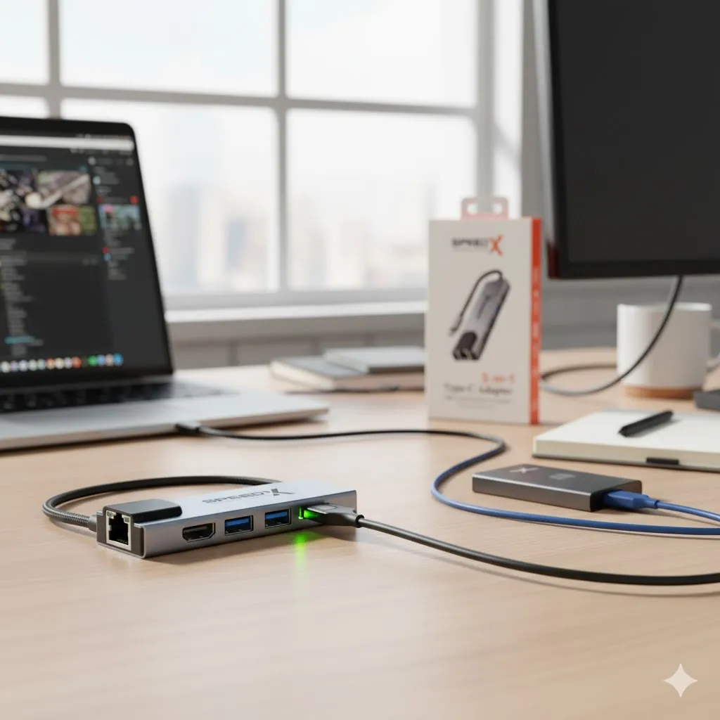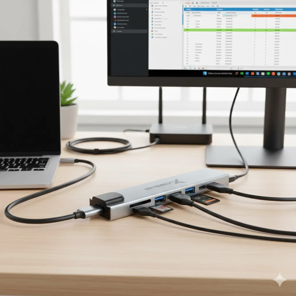 Maximize the potential of your Type-C device, MacBook, or Windows laptop with this premium 8-in-1 USB-C Adapter. This compact unit consolidates eight essential ports—including video, internet, power, and data—making it incredibly versatile and powerful. Whether you are working from home, giving a presentation, or transferring large files, this hub provides robust, reliable connectivity