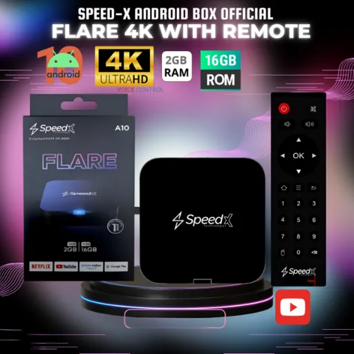 The SPEEDX Flare A10 Quad-Core ARM Cortex A53 Android 10.0 4K Smart TV Box is a high-performance entertainment hub designed to transform your standard television into a full-featured smart TV. Equipped with a powerful Quad-Core ARM Cortex A53 processor, this device ensures lightning-fast processing, smooth performance, and exceptional efficiency for streaming, gaming, and multitasking. Running on the stable and user-friendly Android 10.0 operating system, it gives you access to thousands of apps, games, and streaming platforms right on your TV screen.