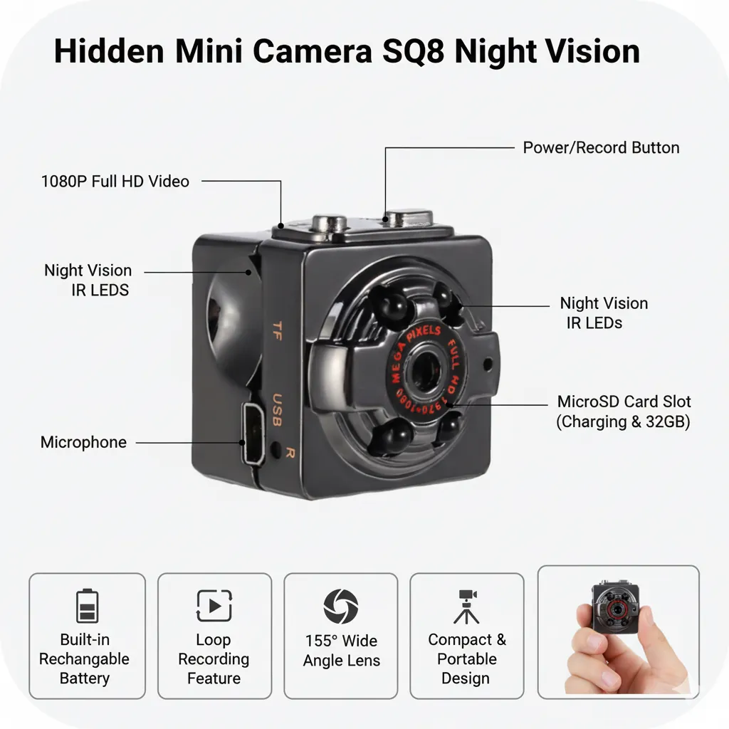 Small in size but big in performance — the SQ8 Hidden Mini Camera is your smart choice for 24/7 monitoring and peace of mind.