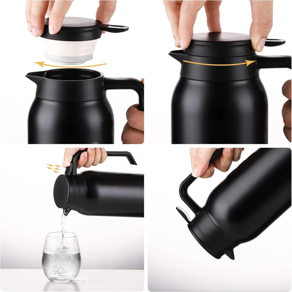 The one-touch press button top lid allows smooth and controlled pouring without opening the entire lid, helping to maintain internal temperature for extended hours. The leak-proof and spill-resistant design ensures safe and mess-free use.