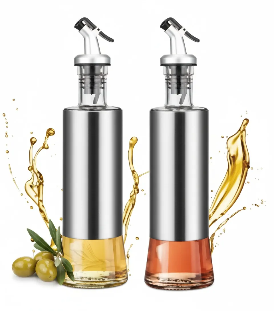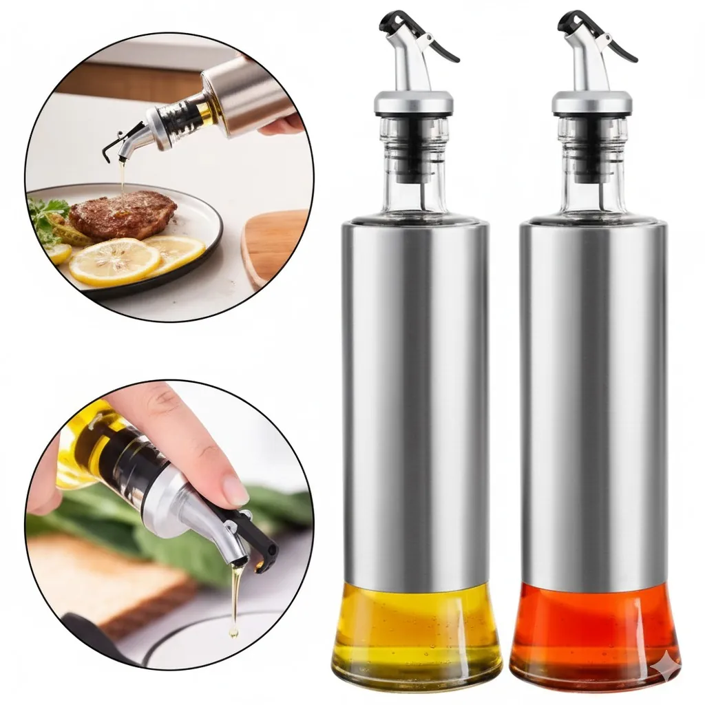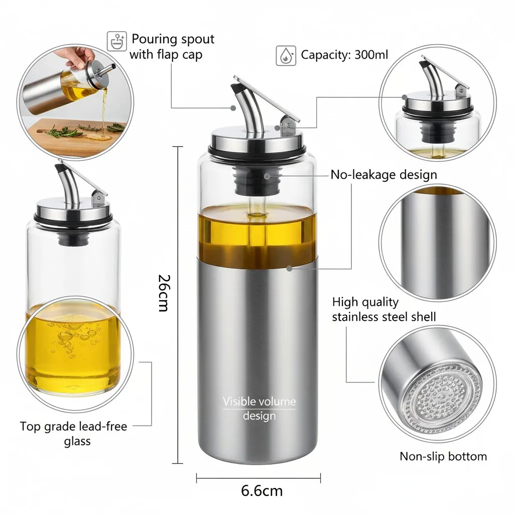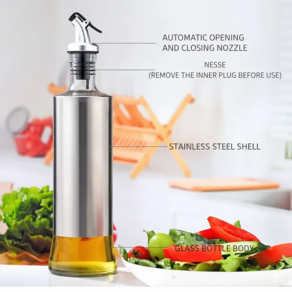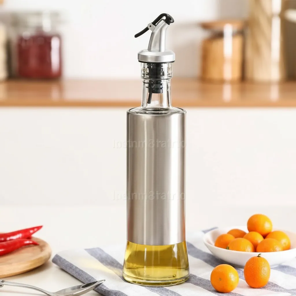 Add a touch of modern elegance and precision to your kitchen with the Stainless Steel and Glass Oil Dispenser Bottle. This dispenser is designed for both style and control, featuring a sleek, brushed stainless steel exterior that protects the contents from excessive light and heat, while the visible glass base allows you to easily monitor the remaining oil level.