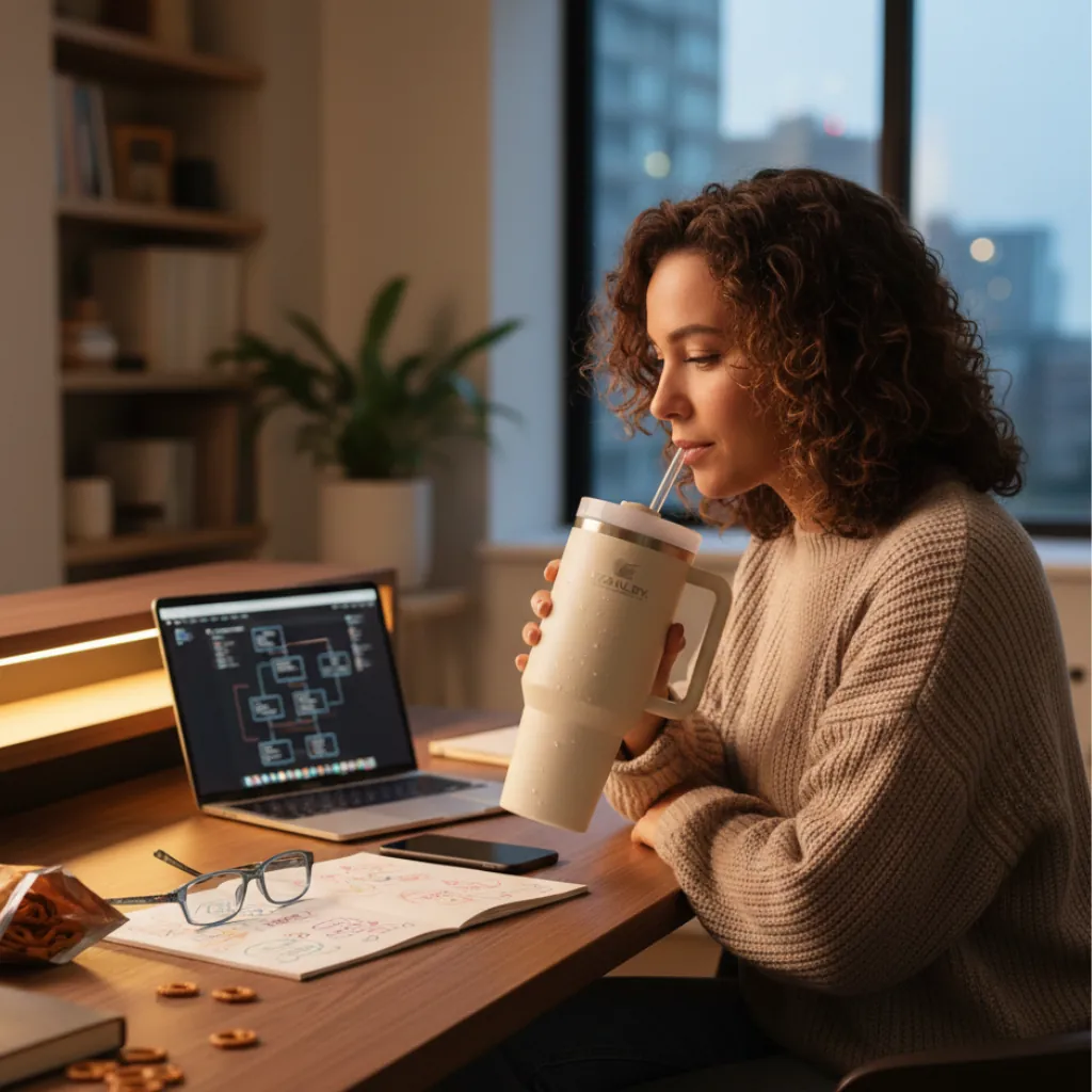 The Stanley Style Tumbler OW-908 900ML is a premium insulated tumbler designed for daily hydration with style and convenience. Built with high-quality stainless steel and double-wall vacuum insulation, it keeps beverages hot or cold for extended hours.