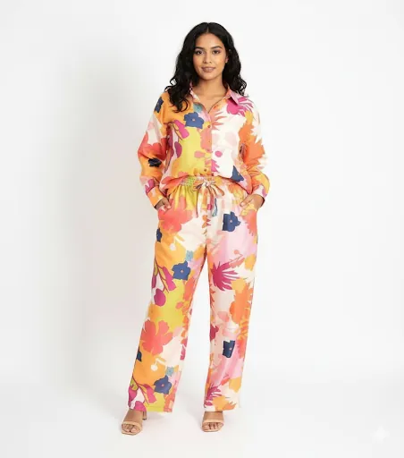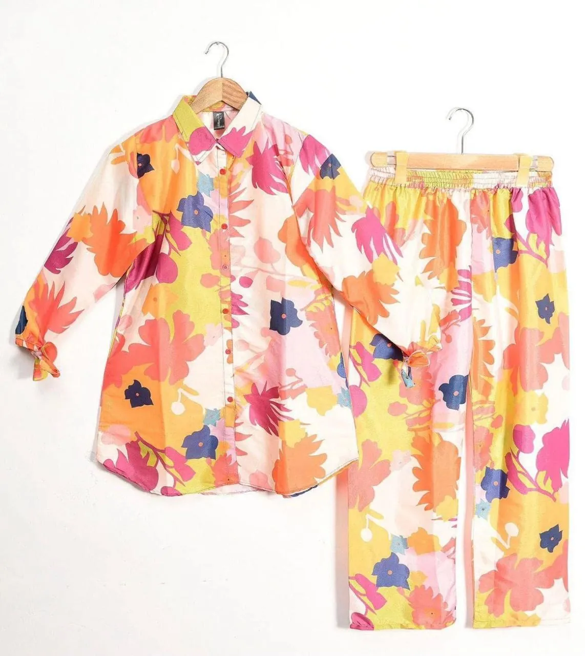 Refresh your wardrobe with this stitched 2-piece floral printed set, a perfect choice for the summer season. The shirt features a button-down style with a collared neckline, bringing both elegance and casual charm. Its bright floral prints in shades of yellow, pink, orange, and navy create a refreshing, youthful vibe. The matching trouser is designed with an elastic waistband, ensuring a comfortable fit while maintaining a chic look. Crafted from soft, breathable fabric, this outfit offers maximum comfort during hot days without compromising on style. Whether you’re heading to a casual outing, a day at work, or a summer get-together, this outfit will keep you looking stylish and feeling comfortable. Pair it with sandals or flats for a relaxed daytime look, or dress it up with accessories for a more polished style.