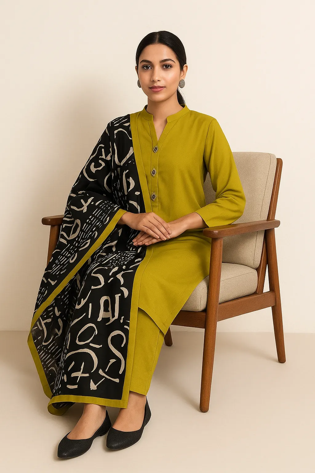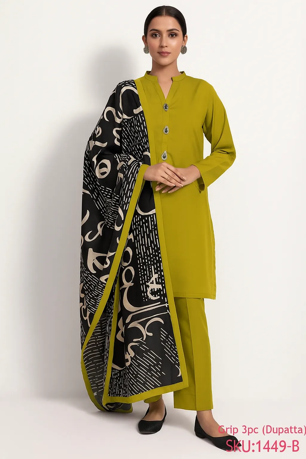 Stitched 3 Piece Suit | Women's Grip Shirt, Trouser & Printed Dupatta (Light Green).Discover a perfect blend of comfort and style with our Stitched 3 Piece Suit in a lovely light green shade. This elegant outfit is crafted from premium Grip fabric, which is known for its soft feel, beautiful drape, and suitability for all-day wear. The set includes a stylish shirt and a matching trouser, complemented by a contrasting black and white printed dupatta that adds a sophisticated touch. As a ready-to-wear ensemble, this suit saves you the hassle of stitching and tailoring, making it a convenient choice for any occasion. The standard size is designed for a comfortable fit, with the shirt featuring a shoulder of 15 inches, a chest of 21 inches, and a length of 40 inches. The trouser has a relaxed waist of 28 inches that stretches up to 44 inches and a length of 38 inches. This versatile suit is perfect for both casual outings and social gatherings.