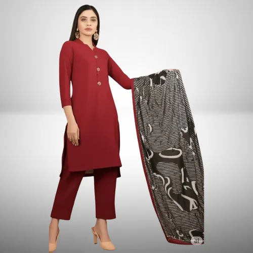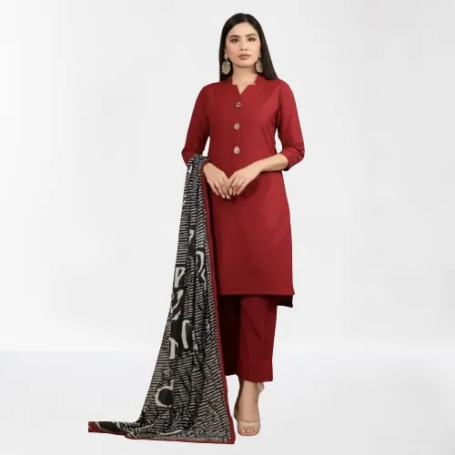 Stitched 3 Piece Suit | Women's Grip Shirt, Trouser & Printed Dupatta (Maroon).Discover a perfect blend of comfort and style with our Stitched 3 Piece Suit in a rich maroon color. This elegant outfit is crafted from premium Grip fabric, which is known for its soft feel, beautiful drape, and suitability for all-day wear. The set includes a stylish shirt and a matching trouser, complemented by a contrasting black and white printed dupatta that adds a sophisticated touch. As a ready-to-wear ensemble, this suit saves you the hassle of stitching and tailoring, making it a convenient choice for any occasion. The standard size is designed for a comfortable fit, with the shirt featuring a shoulder of 15 inches, a chest of 21 inches, and a length of 40 inches. The trouser has a relaxed waist of 28 inches that stretches up to 44 inches and a length of 38 inches. This versatile suit is perfect for both casual outings and social gatherings.