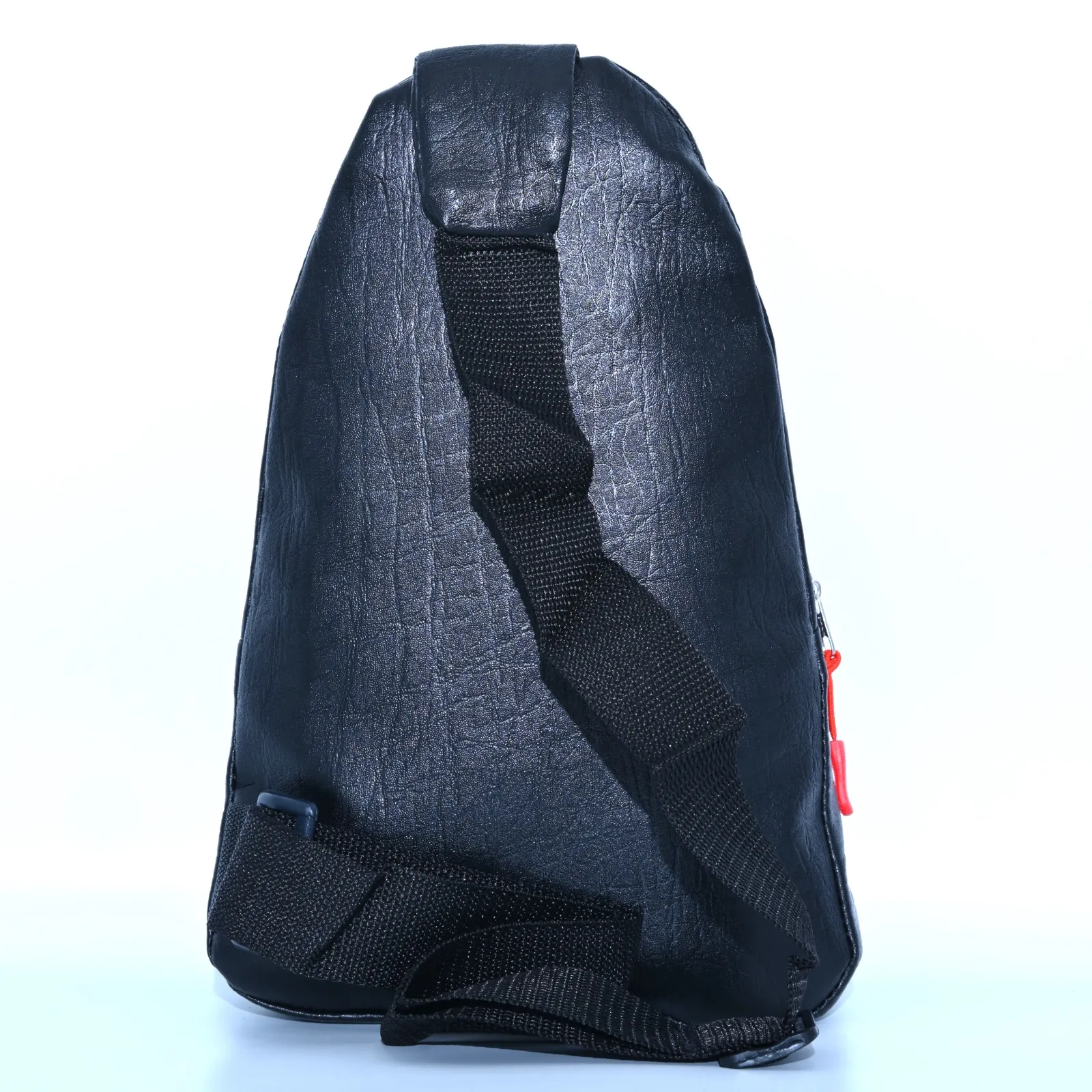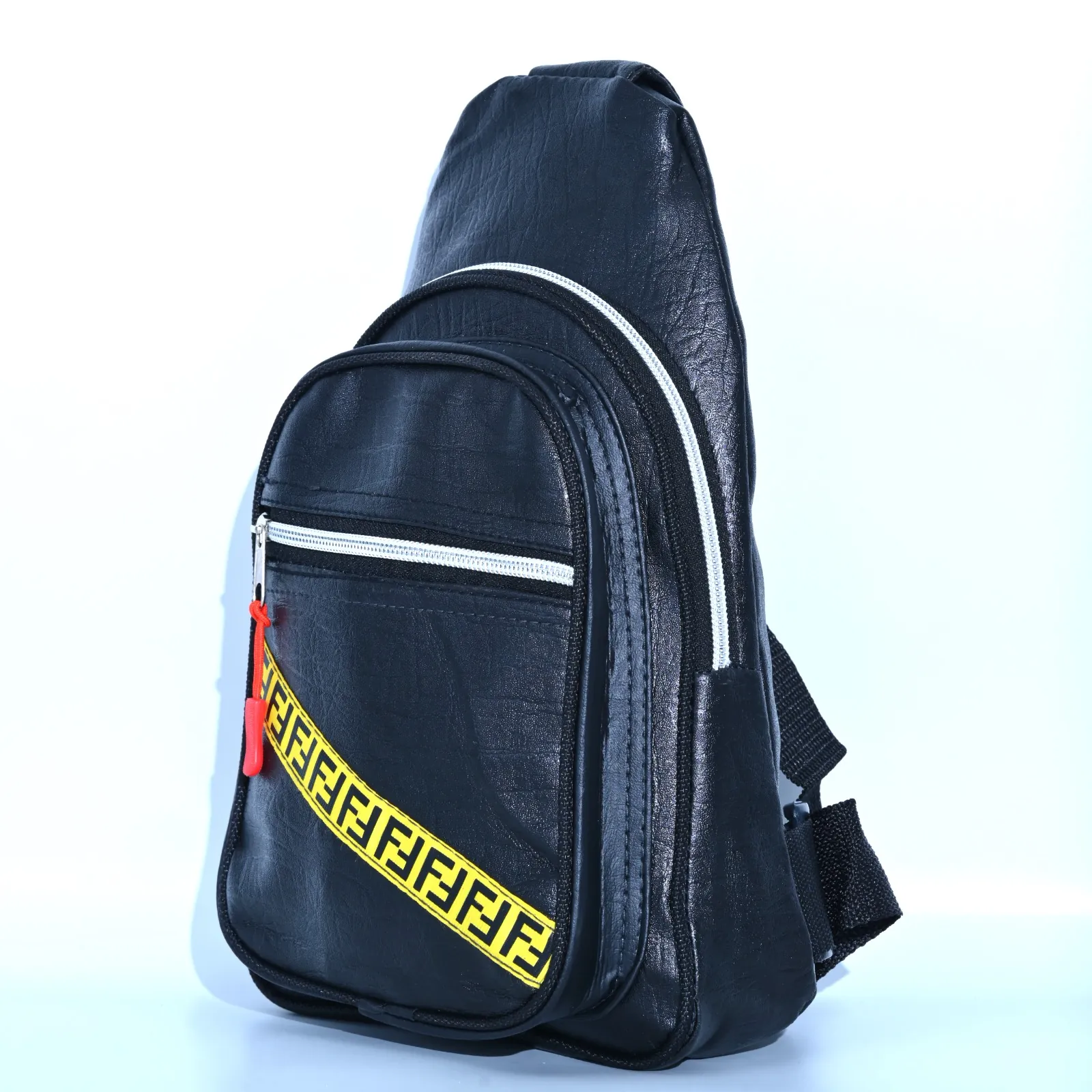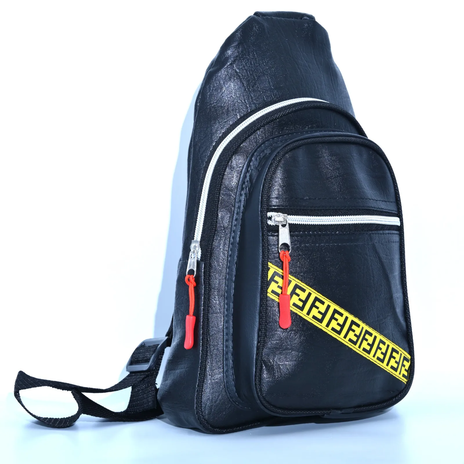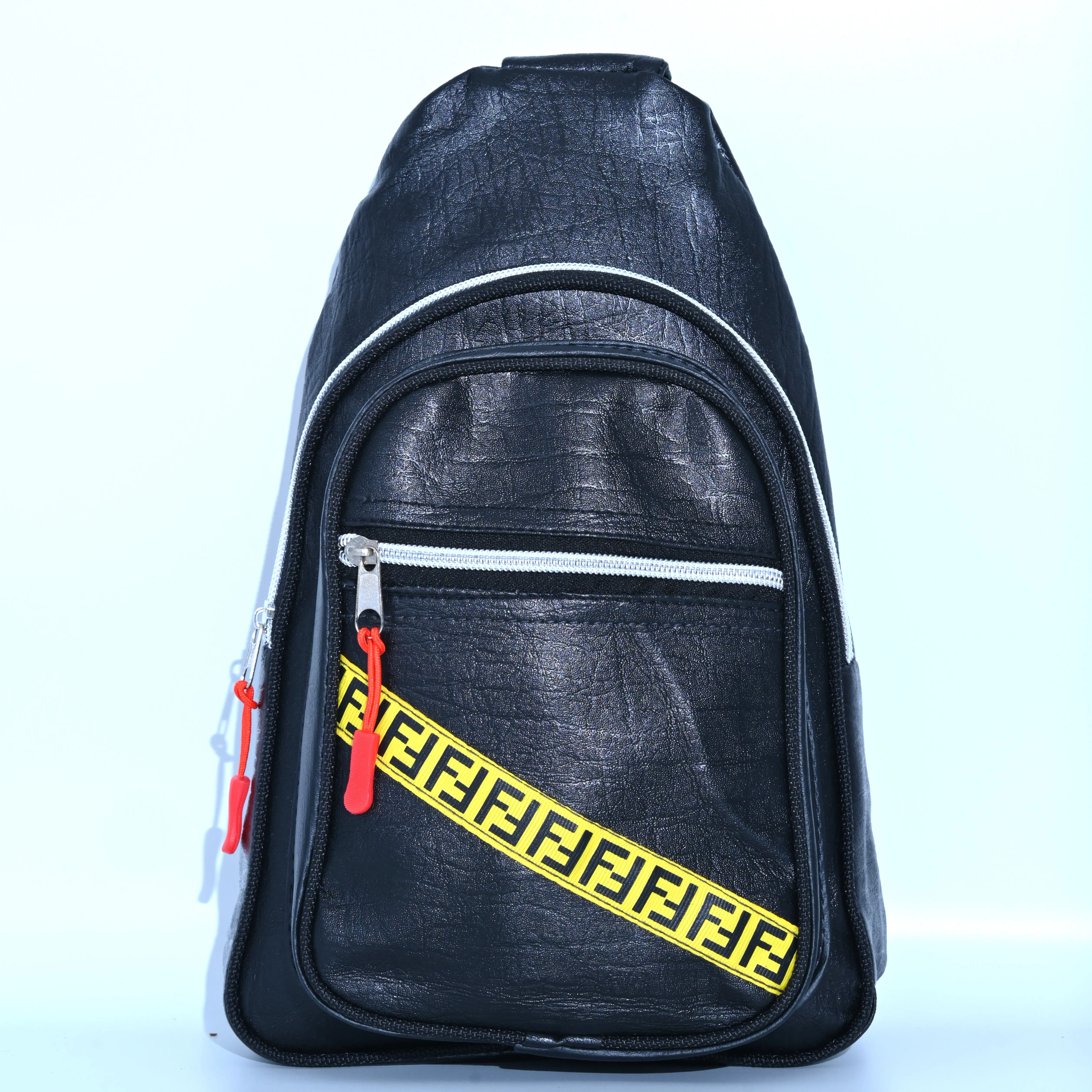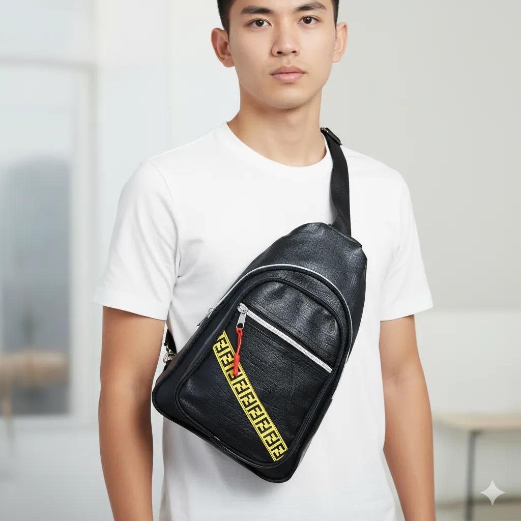 Upgrade your everyday carry with this sleek and compact black sling backpack, crafted from premium faux leather for a sophisticated yet durable finish. Designed for fashion-forward individuals on the go, this backpack features dual zippered compartments with silver-tone zippers and vibrant red pull tabs for an eye-catching contrast. The standout feature is the bold yellow Fendi-inspired branded strap detail across the front pocket, adding a touch of luxury to your streetwear or casual outfit. Perfect for day trips, city commutes, or travel, this sling bag combines practicality with modern style. The adjustable strap ensures a comfortable fit for all-day wear.
