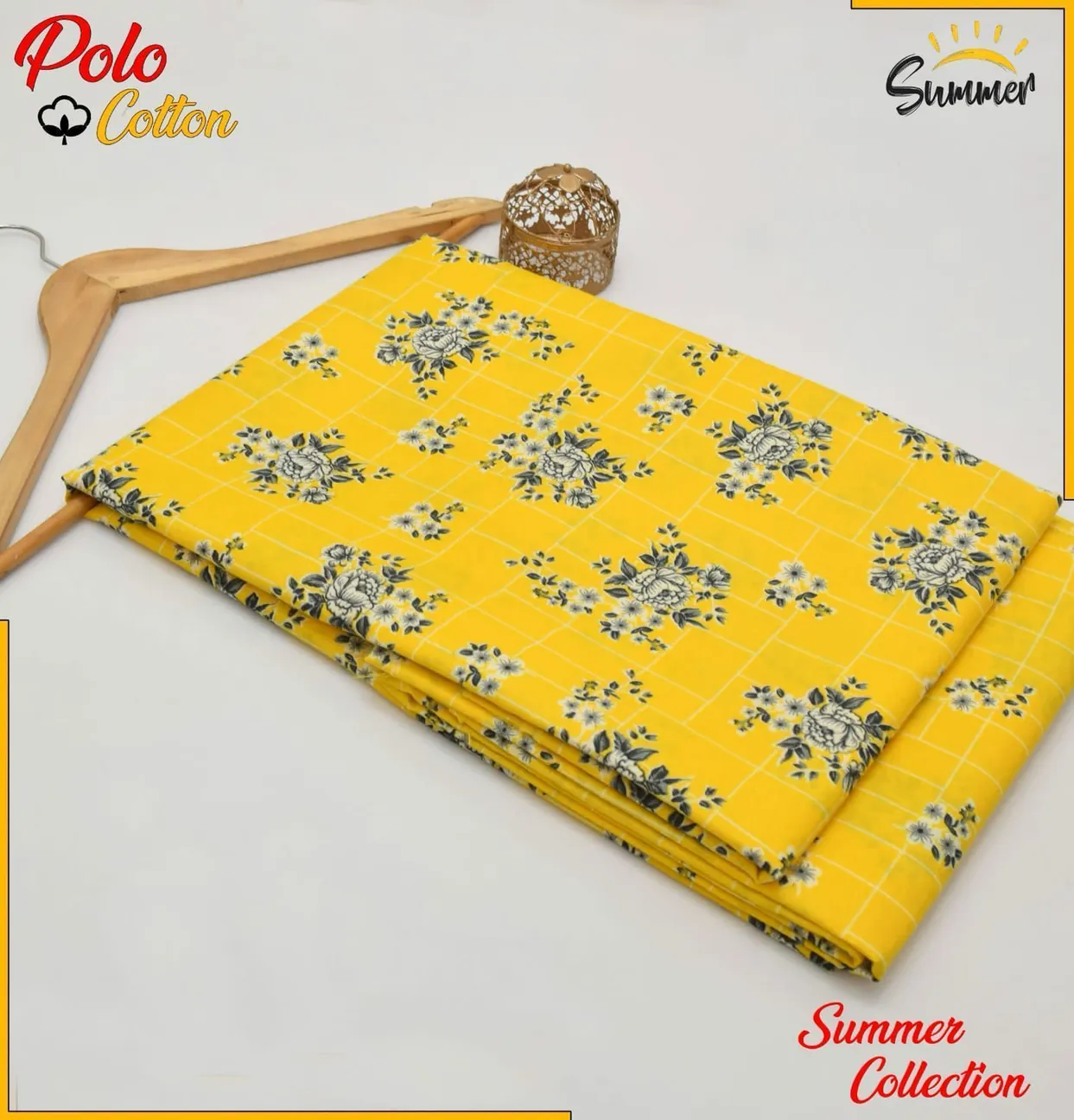 The fabric is neatly folded and presented in a clean, professional product shot, highlighting its vibrant color and intricate pattern. The material feels lightweight and breathable, ideal for hot weather clothing like dresses, shalwar kameez, kurta pajamas, blouses, or skirts. As part of the brand's "Summer Collection," this fabric is specifically marketed for its comfort and style during the warmer months. The "Polo Cotton" label guarantees a premium feel and durability. The inclusion of a wooden hanger in the photo suggests its use for garments. This fabric is a fantastic choice for those looking for a mix of classic floral design with a modern, sunny color palette.