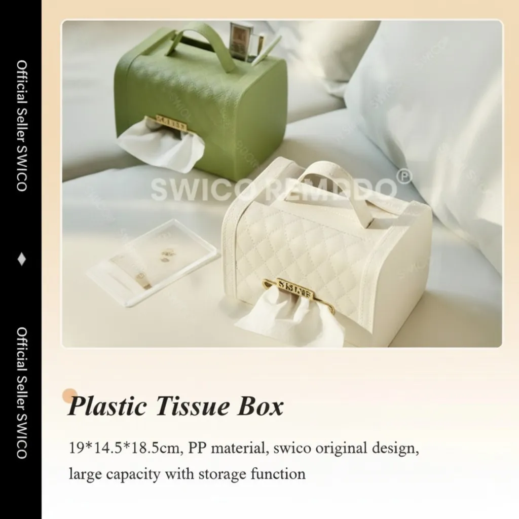 Introducing the SWICO Original Design Tissue Box, a perfect blend of elegance and functionality for your home or office. Crafted from durable PP material, this modern tissue holder features a luxurious quilted texture and a sophisticated golden "SWICO" emblem, adding a touch of chic to any room.