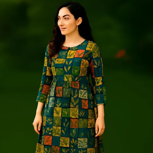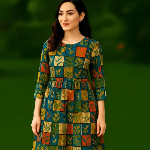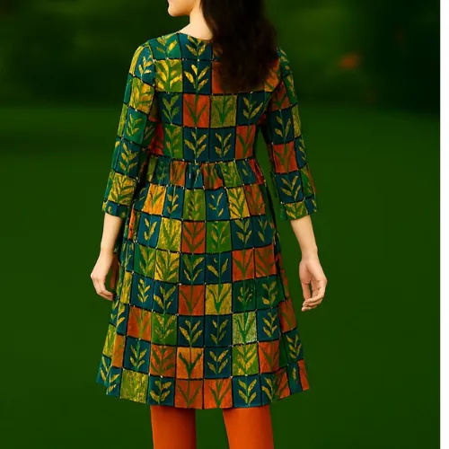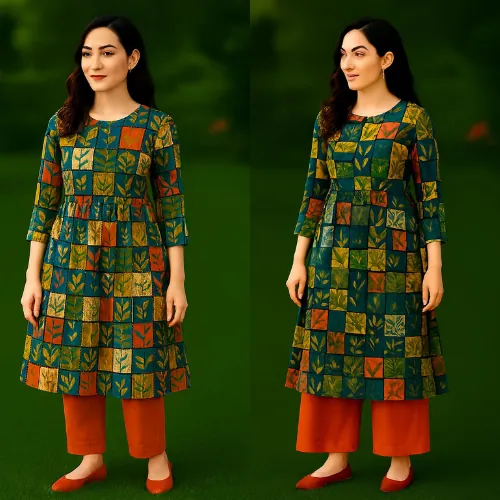 Title: Unstitched 2-Piece Linen Suit: Base mendhi & Multi-Color Checkered and Floral Print. An unstitched linen suit featuring a unique digital print that combines green, blue, and black checkered patterns with orange and yellow floral motifs, paired with a solid orange dyed trouser.This distinctive unstitched suit is crafted from "Linen" with a "Quality 68/72" rating. The shirt fabric showcases an intricate digital print that blends two different styles: a checkered or patchwork pattern in shades of green, blue, and black, interspersed with delicate yellow, orange, and beige flowers. The set is completed with a "Dyed Trouser" in a solid orange color, which perfectly matches the warm tones in the shirt's print. This suit is a modern and stylish choice for custom tailoring.