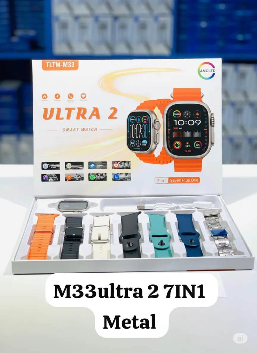 The M33 Ultra 2 7IN1 Smart Watch is the perfect blend of style, technology, and functionality. Designed with a durable Metal alloy casing and a crystal-clear AMOLED screen, it offers a high-end look and responsive user experience. Stay connected with Bluetooth Calling, receive instant notifications, and monitor your health with comprehensive fitness tracking features including heart rate monitoring, sleep analysis, and multi-sport modes. The "7IN1" package is its standout feature, providing an unparalleled selection of wristbands—ranging from sporty silicone to a sophisticated metal strap—ensuring you always have the perfect look. Compatible with both Android and iOS devices, the TLTM-M33 Ultra 2 is the all-in-one smartwatch solution for the modern, active lifestyle.