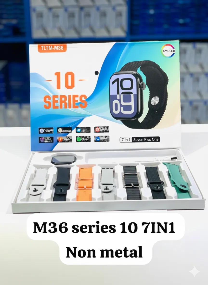 Elevate your wearable technology experience with the TLTM-M36 Series 10 Smartwatch. This non-metal edition features a vibrant AMOLED display for crisp visuals and a user-friendly interface. It's packaged as a highly versatile 7-in-1 set, providing the main watch unit, a charging solution (e.g., wireless charging cable), and seven diverse watch straps/bands (typically in silicone, nylon, or ocean band styles) to match any outfit or activity. Key features include Bluetooth calling for hands-free communication, comprehensive fitness and health tracking (like heart rate, blood pressure, sleep monitoring, and multi-sport modes), music control, notification alerts for social media and calls, and more. Compatible with both Android and iOS devices, this smartwatch offers a feature-rich experience at an affordable price point, perfect for users seeking style and functionality in one complete package.