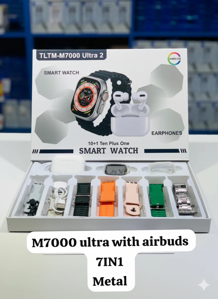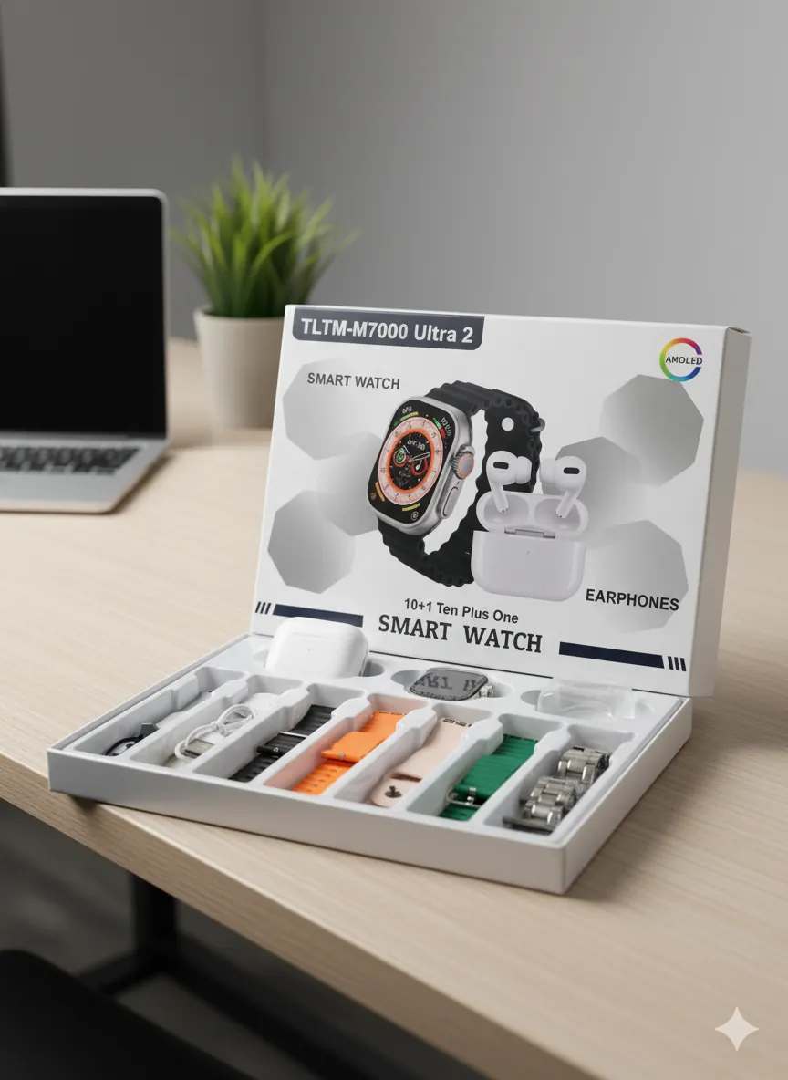 Elevate your digital lifestyle with the TLTM-M7000 Ultra 2 Smart Watch 7-in-1 Combo. This premium set provides exceptional value, packaging a high-performance smartwatch with a vivid AMOLED screen, Bluetooth calling capability, and extensive health monitoring features. The 7IN1 set includes the smart watch unit, a pair of compatible Airbuds (wireless earphones) for seamless audio and calls, a wireless charging cable, and a collection of multiple interchangeable straps (including metal and various silicone colors) to match any outfit or activity. Perfect for fitness enthusiasts, tech-savvy users, and anyone seeking a versatile and stylish wearable. Stay connected, track your fitness, and enjoy your music—all from one luxurious box.