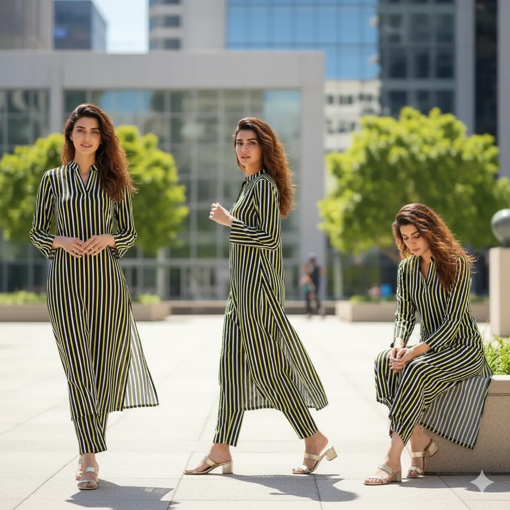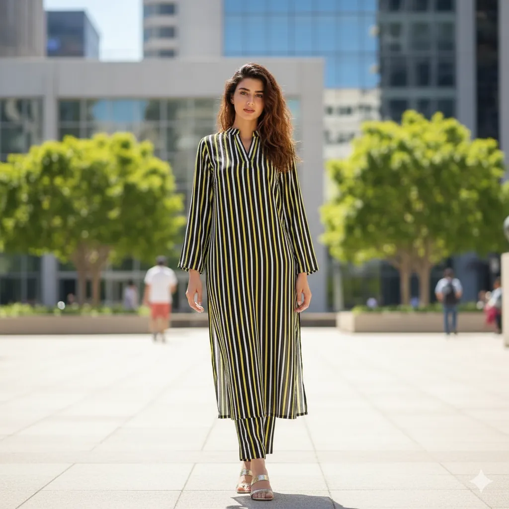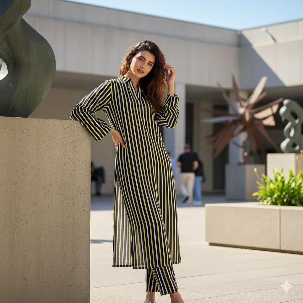 Trendy Stitched 2-Piece Printed Grip Suit - Black, White & Yellow Stripes.This stitched 2-piece printed suit, a part of our special "New Summer Collection," will significantly enhance your fashion. It is crafted from premium grip fabric, which is extremely comfortable and lightweight for summer wear. Both the shirt and trousers feature vertical black, white, and yellow stripes, giving the suit a sophisticated and stylish appeal. Its design is not only fashionable but also provides a classic and timeless look.