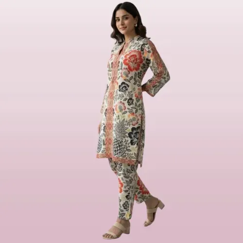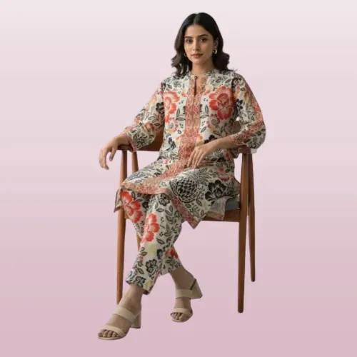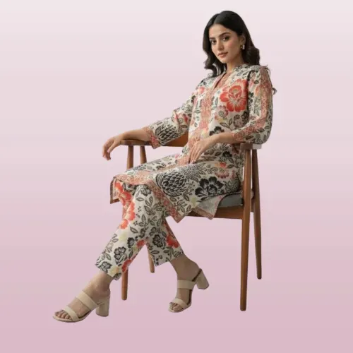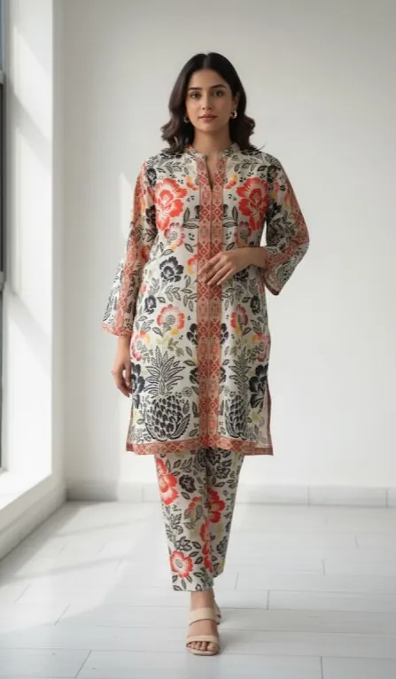 Refresh your wardrobe with this beautifully crafted women’s 2-piece stitched suit. The kurta is adorned with vibrant digital floral prints in shades of red, orange, black, and beige over a soft cream base, creating a modern yet traditional look. The matching trouser carries the same floral pattern, making it a complete and stylish outfit. Designed with comfortable and breathable fabric, this outfit is perfect for all-day wear—whether at work, casual meetups, or semi-formal occasions. Pair it with heels or flats for a graceful and chic appearance.