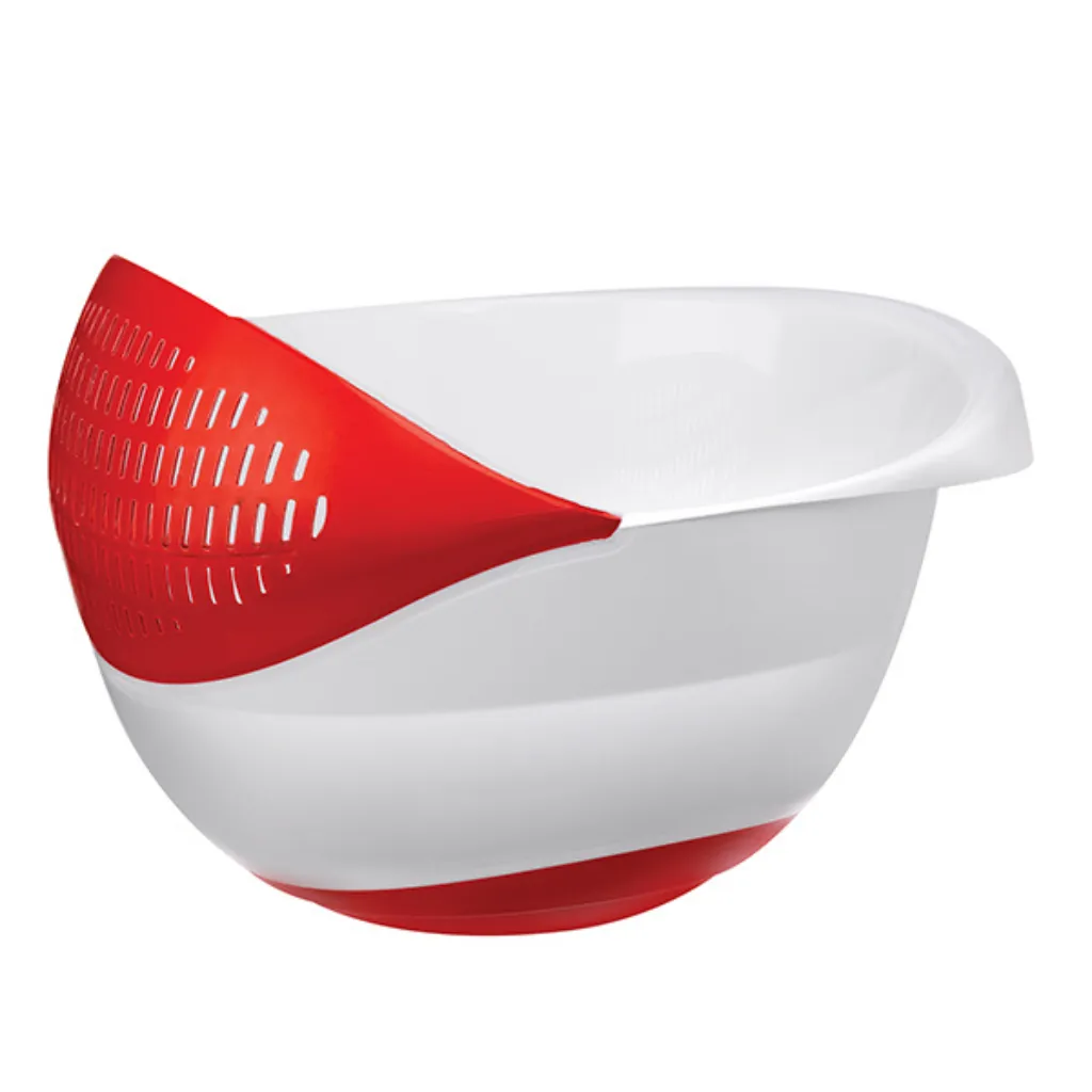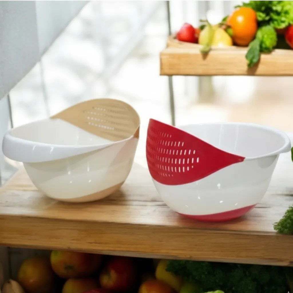 The Two Color Washer Strainer Bowl is a practical and stylish kitchen tool designed to make washing and draining food items easier and faster. This bowl features a smart 2-in-1 design that allows you to wash fruits, vegetables, rice, and pulses and then strain water without transferring contents to another utensil.