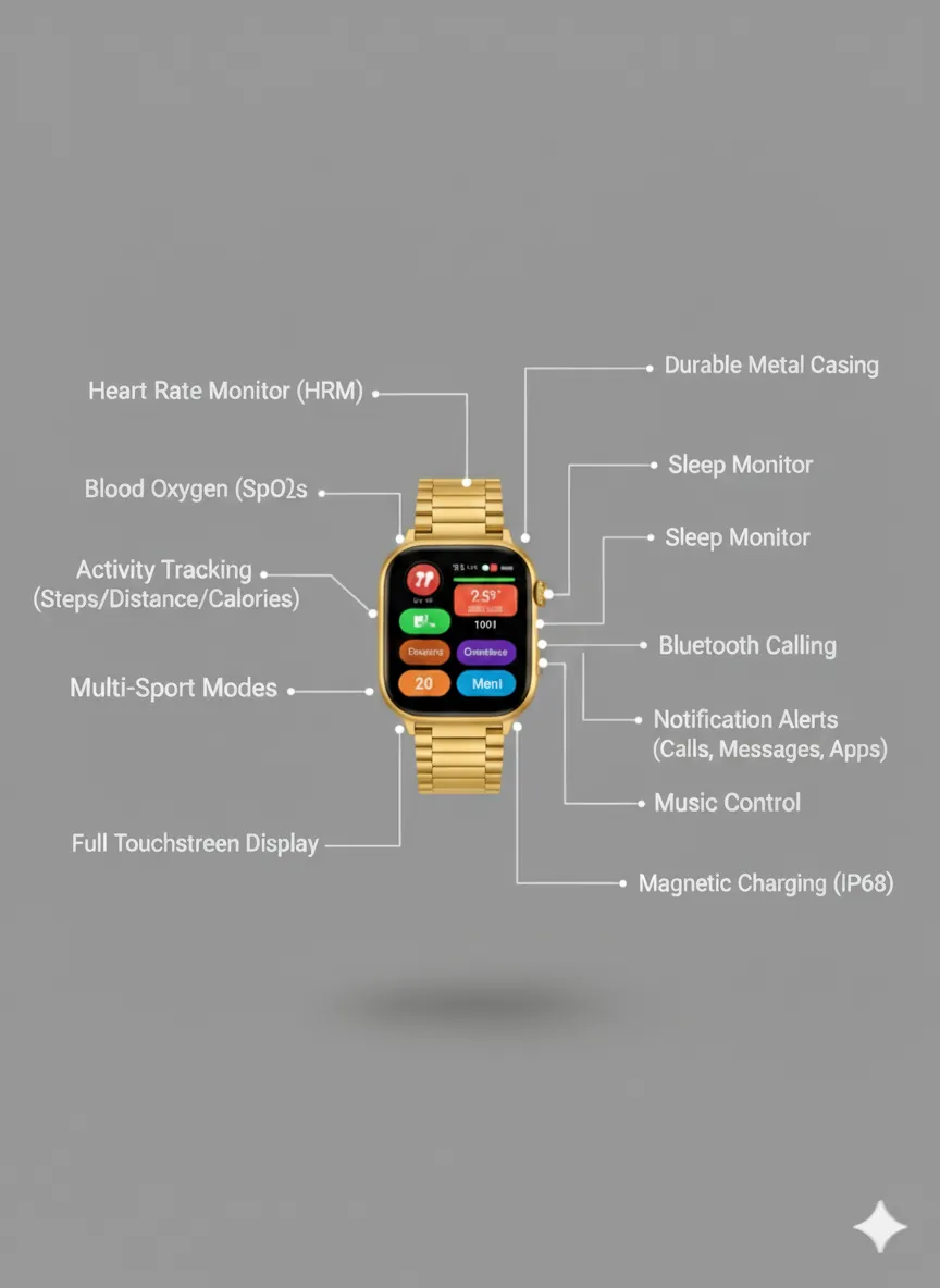 Experience the perfect blend of luxury and technology with the Ultra 2 Smart Watch Gold Edition. Designed for both style-conscious men and women, this set provides an unparalleled level of customization and functionality. The watch boasts a vibrant AMOLED display for crystal-clear viewing and is encased in a striking gold-colored body, highlighted by a deluxe metal link strap for a premium aesthetic.