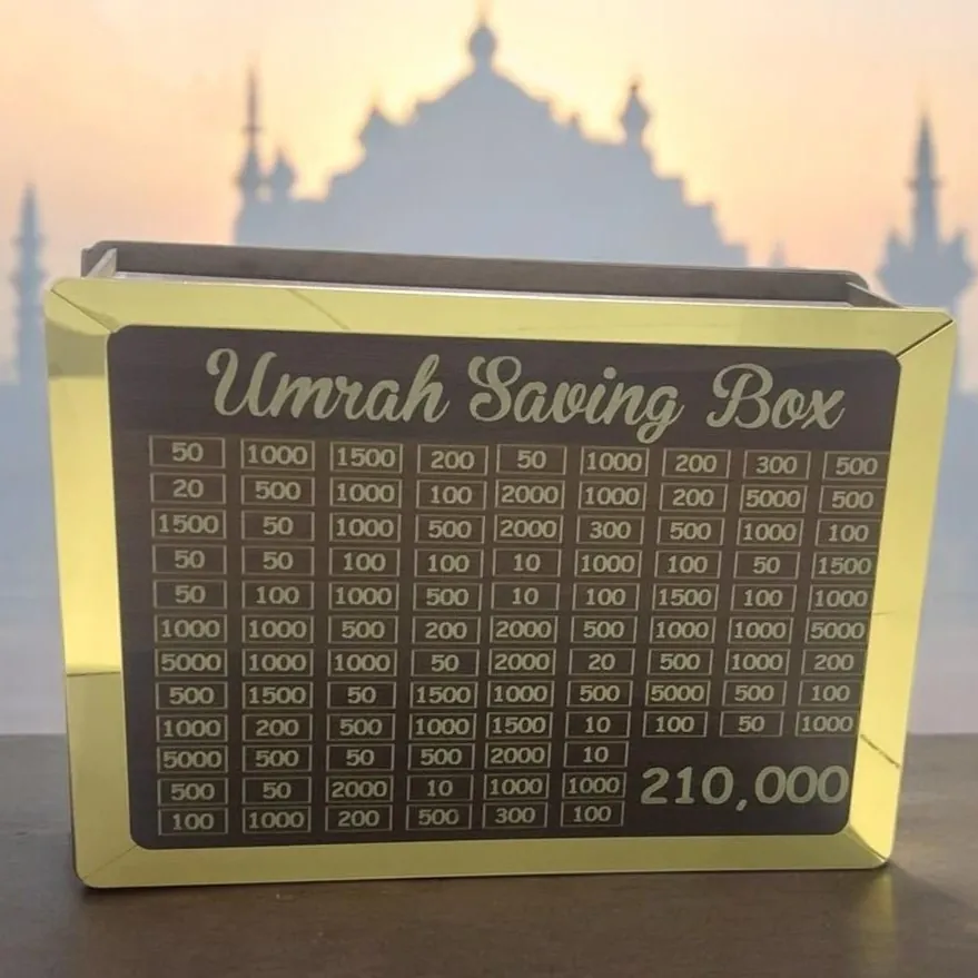 Plan your spiritual journey with our Umrah Savings Goal Tracker Box. This beautifully designed box helps you track your progress towards your Umrah pilgrimage fund. Featuring pre-set denominations, it makes saving systematic and visually rewarding. A meaningful way to prepare for your sacred journey.