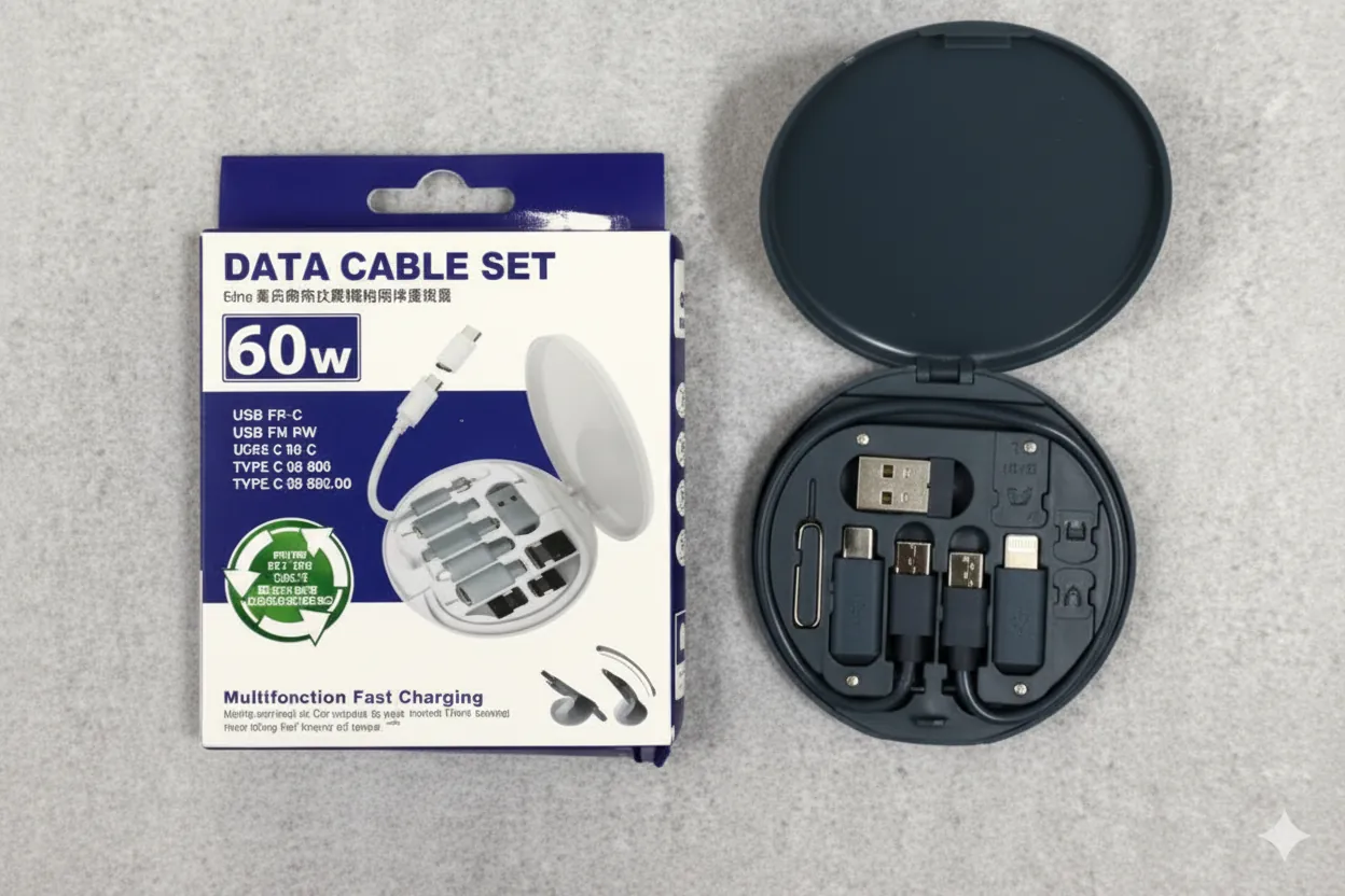This 5-in-1 multi-functional data cable set offers a convenient and compact solution for all your charging and data transfer needs. Supporting 60W fast charging, it's compatible with both Android and iPhone devices. The set includes multiple connectors for various devices, enabling charging and data transfer. Additionally, it features a built-in mobile phone holder for hands-free use and a SIM card removal tool for added utility. Keep all your essential connections organized in one portable case.