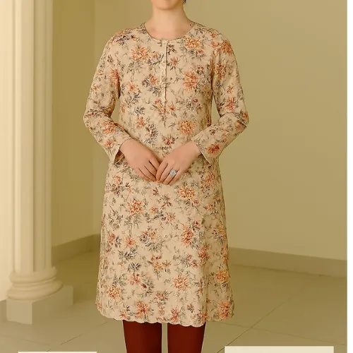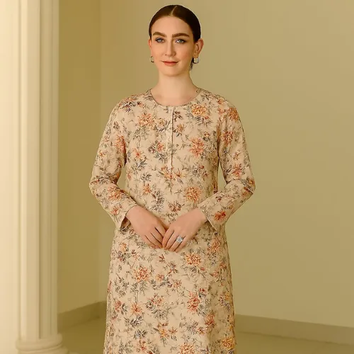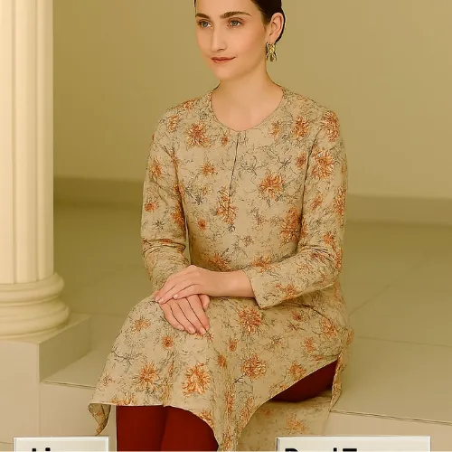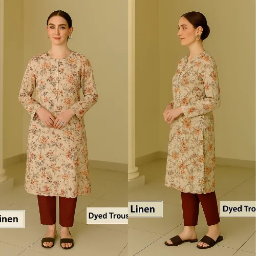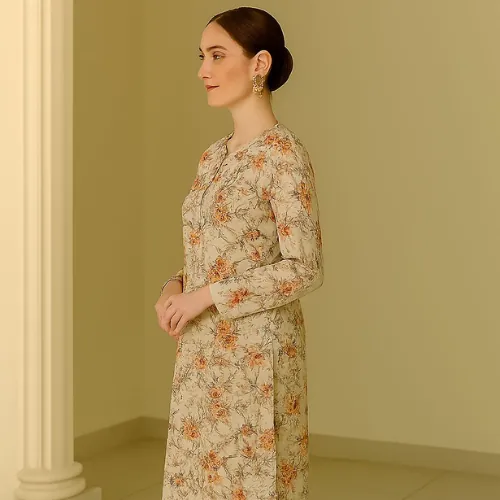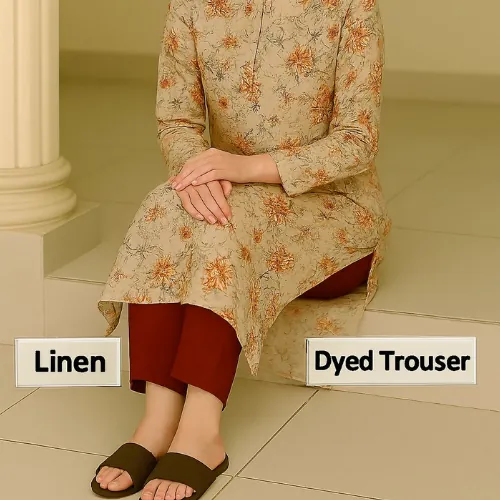 Unstitched 2-Piece Linen Suit: Beige with Peach and Maroon Floral Print. An elegant unstitched linen suit featuring a digital floral print in shades of peach, red, and brown on a light beige base, paired with a solid maroon dyed trouser.This unstitched suit is crafted from "Linen" with a "Quality 68/72" rating. The shirt fabric has a light beige or cream background, adorned with a digital floral print featuring prominent shades of peach/orange, red, and brown/maroon. The set is completed with a "Dyed Trouser" in a solid maroon or dark red color, which perfectly complements the print. This unstitched suit is a sophisticated choice for creating a timeless and custom-tailored outfit.