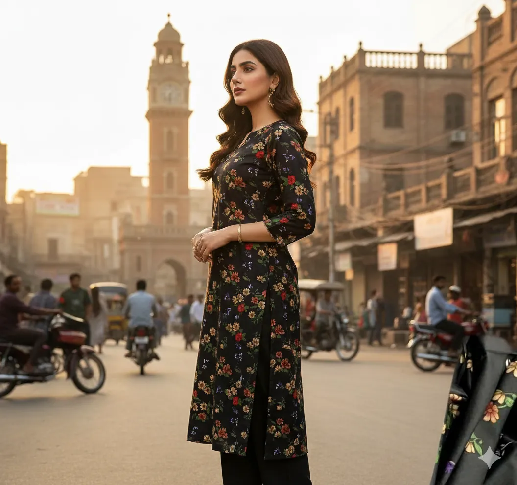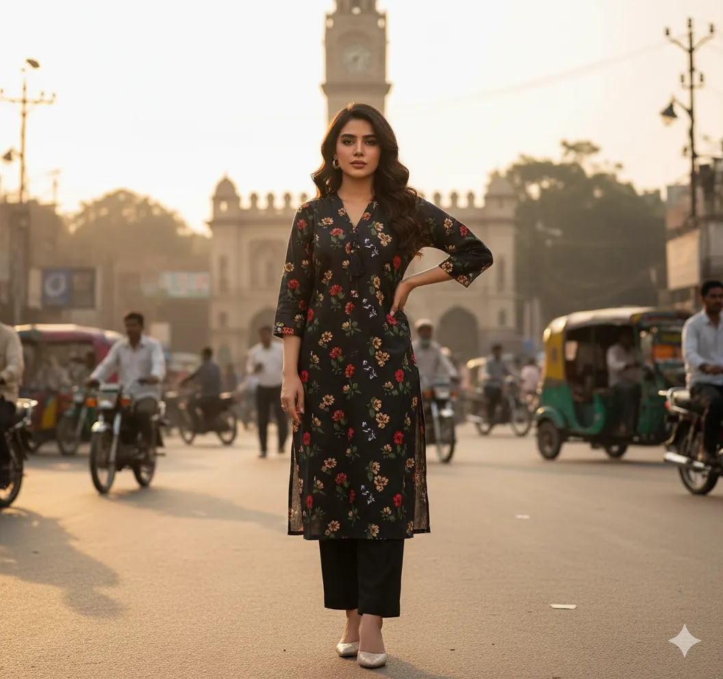 Unstitched 2-Piece Linen Suit: Black with Multi-Color Floral Print.This modern 2-piece unstitched linen suit features a black base with a multi-colored floral digital print, complemented by a solid black dyed trouser.Discover a sleek and modern style with this unstitched 2-piece linen suit. The main fabric is a deep black with a vibrant, multi-colored floral print, featuring flowers in shades of red, yellow, and white. The suit includes a printed shirt and a coordinating "Dyed Trouser" in a solid black color, creating a cohesive and elegant look. Crafted from high-quality 68/72 linen, this ensemble is both comfortable and durable, ensuring a beautiful drape and feel.